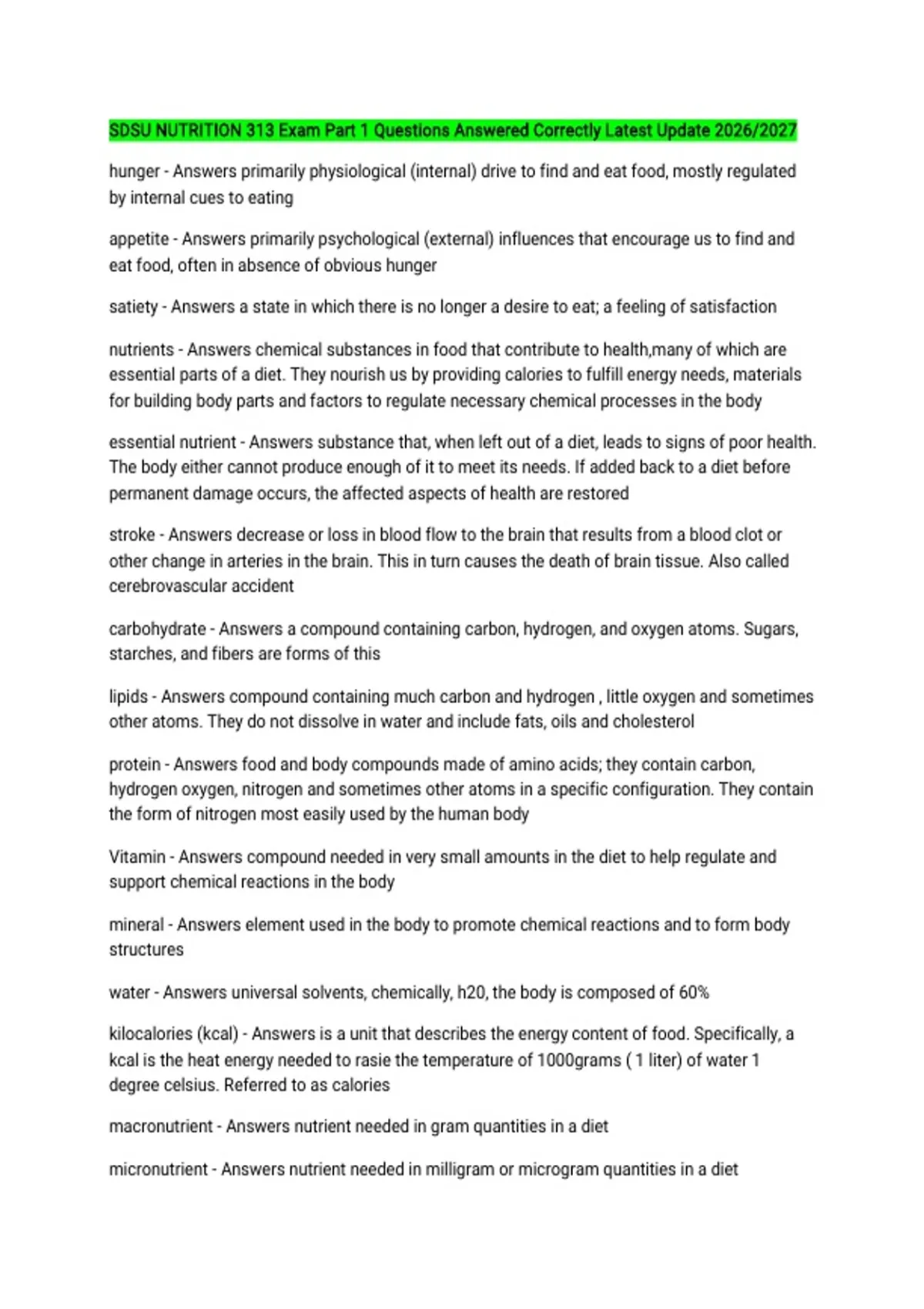 SDSU NUTRITION 313 Exam Part 1 Questions Answered Correctly Latest Update 2026/2027 hunger - Answers primarily physiological (internal) drive to find and eat food, mostly regulated by internal cues to eating appetite - Answers primarily psychological (external) influences that encourage us to find and eat food, often in absence of obvious hunger satiety - Answers a state in which there is no longer a desire to eat; a feeling of satisfaction nutrients - Answers chemical substances in food that contribute to health,many of which are essential parts of a diet. They nourish us by providing calories to fulfill energy needs, materials for building body parts and factors to regulate necessary chemical processes in the body essential nutrient - Answers substance that, when left out of a diet, leads to signs of poor health. The body either cannot produce enough of it to meet its needs. If added back to a diet before permanent damage occurs, the affected aspects of health are restored stroke - Answers decrease or loss in blood flow to the brain that results from a blood clot or other change in arteries in the brain. This in turn causes the death of brain tissue. Also called cerebrovascular accident carbohydrate - Answers a compound containing carbon, hydrogen, and oxygen atoms. Sugars, starches, and fibers are forms of this lipids - Answers compound containing much carbon and hydrogen , little oxygen and sometimes other atoms. They do not dissolve in water and include fats, oils and cholesterol protein - Answers food and body compounds made of amino acids; they contain carbon, hydrogen oxygen, nitrogen and sometimes other atoms in a specific configuration. They contain the form of nitrogen most easily used by the human body Vitamin - Answers compound needed in very small amounts in the diet to help regulate and support chemical reactions in the body mineral - Answers element used in the body to promote chemical reactions and to form body structures water - Answers universal solvents, chemically, h20, the body is composed of 60% kilocalories (kcal) - Answers is a unit that describes the energy content of food. Specifically, a kcal is the heat energy needed to rasie the temperature of 1000grams ( 1 liter) of water 1 degree celsius. Referred to as calories macronutrient - Answers nutrient needed in gram quantities in a diet micronutrient - Answers nutrient needed in milligram or microgram quantities in a diet simple sugar - Answers monosaccharide or disaccharide in the diet complex carbohydrate - Answers composed of many sugar units (polysaccharide) Ex. glycogen, starch, and fiber starch - Answers carbohydrate made of multiple units of glucose attached together in a form the body can digest; also known as complex carbohydrate fiber - Answers substances in plant foods not digested by the processes that take place in the human stomach or small intestine. These add bulk to feces. It is naturally found in foods also called dietary fiber cell - Answers structural basis of plant and animal organization. Cells have the ability to take up compounds from and excrete compounds into their surroundings bond - Answers linkage between two atoms, such as that formed by the sharing of electrons enzyme - Answers compound that speeds the rate of a chemical reaction but is not altered by the reaction. Almost all of these are proteins ( some made of genetic material) amino acid - Answers building block for proteins containing a central carbon atom with nitrogen and other atoms attached chemical reaction - Answers interaction between two chemicals that changes both chemicals water soluble vitamins - Answers vitamins that dissolve in water. These vitamins are the B&C vitamins fat soluble vitamins - Answers vitamins that dissolve in fat such substances as ether and benzene but not readily in water. These are vitamins A,D,E,K inorganic - Answers any substance lacking carbon atoms bonded to hydrogen atoms in the chemical structure major mineral - Answers vital to health, required in diet in amounts greater than 100 milligrams per day trace mineral - Answers vital to health, required in the diet in amounts less than 100 milligrams per day electrolytes - Answers substances that separate into ions in water and in turn are able to conduct an electrical current. These include sodium, chloride, and potassium solvent - Answers liquid substance in which other substances dissolve metabolism - Answers chemical processes in the body by which energy is provided in useful forms and vital activites are sustained phytochemical - Answers chemical found in plants. Some may contribute to a reduced risk of cancer or cardiovascular disease in people who consume them regularly scurvy - Answers vitamin c deficiency disease characterized by weakness, fatigue, slow wound healing, opening of previously healed wounds, bone pain, fractures, sore and bleeding gums, diarrhea, and pinpoint hemorrhages on the skin epidemiology - Answers study of how diseases rates vary among different population groups malnutrition - Answers failing health that results from long standing dietary practices that do not coincide with nutritional needs overnutrition - Answers state in which nutritional intake greatly exceeds the body's needs undernutrition - Answers failing health that results from long standing dietary intake that is not enough to meet nutritional needs subclinical - Answers stagen of a disease or disorder not sever enough to produce symptoms that can be detected or diagnosed anthropometric assessment - Answers measurement of body weight and the lengths, circumferences and thickness of parts of the body biochemical assessment - Answers measurement of biochemical functions related to a nutrients functions clinical assessment - Answers examination of general appearance of skin, eye, and tongue; evidence of rapid hair loss; sense of touch; and ability to cough and walk environmental assessment - Answers includes details about living conditions education level a
