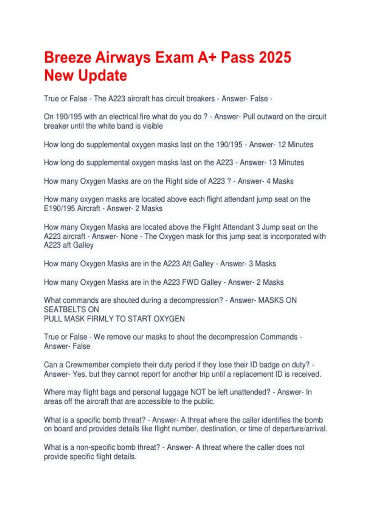 Breeze Airways Exam A+ Pass 2025 New Update True or False - The A223 aircraft has circuit breakers - Answer- False - On 190/195 with an electrical fire what do you do ? - Answer- Pull outward on the circuit breaker until the white band is visible How long do supplemental oxygen masks last on the 190/195 - Answer- 12 Minutes How long do supplemental oxygen masks last on the A223 - Answer- 13 Minutes How many Oxygen Masks are on the Right side of A223 ? - Answer- 4 Masks How many oxygen masks are located above each flight attendant jump seat on the E190/195 Aircraft - Answer- 2 Masks How many Oxygen Masks are located above the Flight Attendant 3 Jump seat on the A223 aircraft - Answer- None - The Oxygen mask for this jump seat is incorporated with A223 aft Galley How many Oxygen Masks are in the A223 Aft Galley - Answer- 3 Masks How many Oxygen Masks are in the A223 FWD Galley - Answer- 2 Masks What commands are shouted during a decompression? - Answer- MASKS ON SEATBELTS ON PULL MASK FIRMLY TO START OXYGEN True or False - We remove our masks to shout the decompression Commands - Answer- False Can a Crewmember complete their duty period if they lose their ID badge on duty? - Answer- Yes, but they cannot report for another trip until a replacement ID is received. Where may flight bags and personal luggage NOT be left unattended? - Answer- In areas off the aircraft that are accessible to the public. What is a specific bomb threat? - Answer- A threat where the caller identifies the bomb on board and provides details like flight number, destination, or time of departure/arrival. What is a non-specific bomb threat? - Answer- A threat where the caller does not provide specific flight details. What should a Crewmember do if they receive or overhear a personal bomb threat? - Answer- -Notify the Captain immediately (DO NOT allow the guest on board). -Keep the person making the threat under surveillance. -Note their physical features and unusual characteristics. -If they leave, note transportation details but do not forcibly detain them. What should Crewmembers never do with an identified or suspected explosive device? - Answer- Never approach, touch, cover, or disturb the device. What details should Crewmembers note if they find a suspicious device? - Answer- Bomb components such as power supply, wires, detonator, switch, markings, or military nomenclature. What emergency procedure should be used to notify the Flight Crew of a bomb threat? - Answer- Use the Emergency signal, ensuring guests do not overhear. What is the Least Risk Bomb Location (LRBL) on Breeze aircraft? - Answer- E190 & E195: Second to last row, aircraft left window. A223: Center of R2 cabin door. What is the first step in relocating a suspected bomb? - Answer- Check for an anti-lift switch by carefully sliding a safety card under the device. What materials should be used for the Bomb Stack procedure? - Answer- Hard luggage, at least 10 inches of wet material, plastic sheets, and soft materials. Where should the Flight Attendant assigned to the AFT jump seat sit if a bomb stack is made? - Answer- In the last row of guest seats or as far from the bomb stack as possible while still reaching an exit. What should be done if a bomb cannot be relocated? - Answer- -Move guests at least four rows away. -Cover the device with plastic. -Pack at least 10 inches of wetted clothing around and on top. -Fill remaining areas with soft materials. What power source should be turned off in the event of a bomb threat? - Answer- The AFT galley power. What should be done after securing a suspect device? - Answer- Notify the Captain and prepare for landing. What are the four threat levels on an aircraft? - Answer- Level 1 - Disruptive behavior (suspicious or threatening) Level 2 - Physically abusive behavior Level 3 - Life-threatening behavior Level 4 - Attempted or actual breach of the Flight Deck Who serves as the In-flight Security Coordinator (ISC)? - Answer- The Pilot-in-Command (PIC) serves as the ISC and performs duties per the company's security program. What is a threat Level to enter the Flight Deck considered? - Answer- Level 4: Attempted or actual breach of the Flight Deck What are acceptable identification credentials for FAA Aviation Safety Inspector to aircraft access? - Answer- Form 110A credential What six details should be provided to the flight crew when reporting a fire? - Answer- 1) location and size 2) presence and color of Smoke 3) presence of visible flames 4) presence of odors 5) status of firefighting efforts 6) request Smoke evacuation if needed What are the six types of turbulence? - Answer- 1 light chop 2 light turbulence 3 Moderate Chop 4 moderate turbulence 5 severe turbulence 6 extreme turbulence What are the three turbulence warning levels? - Answer- 1 expected-notice exist 2 impending-short but sufficient 3 eminent or occurring- without any advance notice sudden unexpected At what time do we begin serving water during a tarmac delay? - Answer- 45 min By what time must water and snacks be distributed during a tarmac delay? - Answer- 2 hr Within how many days must alcohol-related events be reported to the FAA? - Answer- 5 days