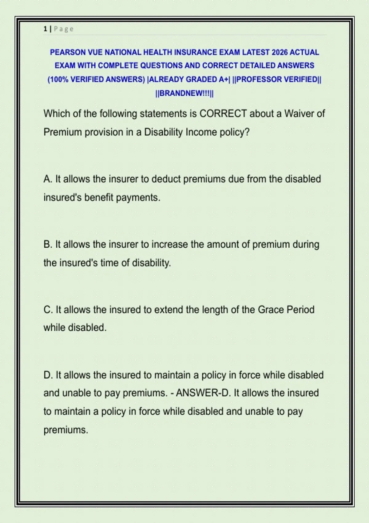 PEARSON VUE NATIONAL HEALTH INSURANCE EXAM LATEST 2026 ACTUAL EXAM WITH COMPLETE QUESTIONS AND CORRECT DETAILED ANSWERS (100% VERIFIED ANSWERS) |ALREADY GRADED A+| ||PROFESSOR VERIFIED|| ||BRANDNEW!!!||