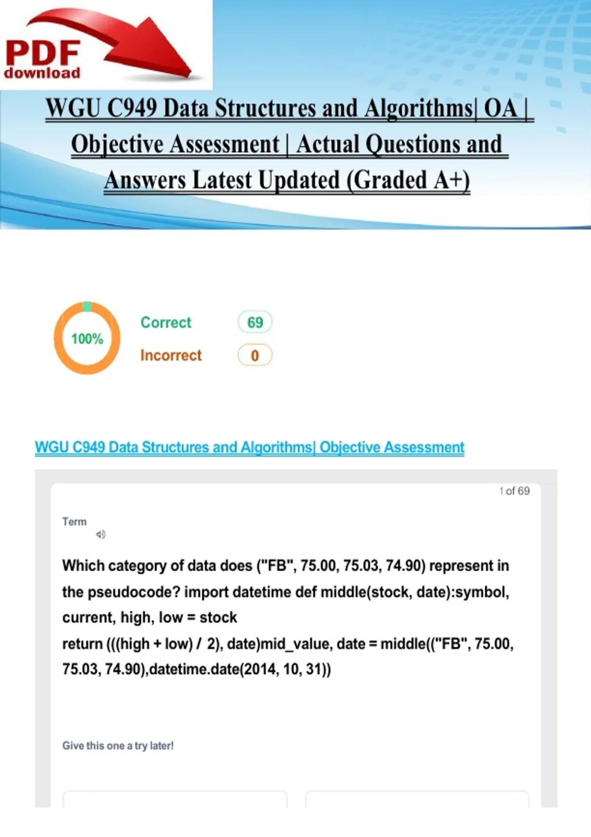 WGU C949 Data Structures and Algorithms| OA | Objective Assessment | 69 Actual Questions and Answers Latest Updated 2026/2027 (Graded A+)