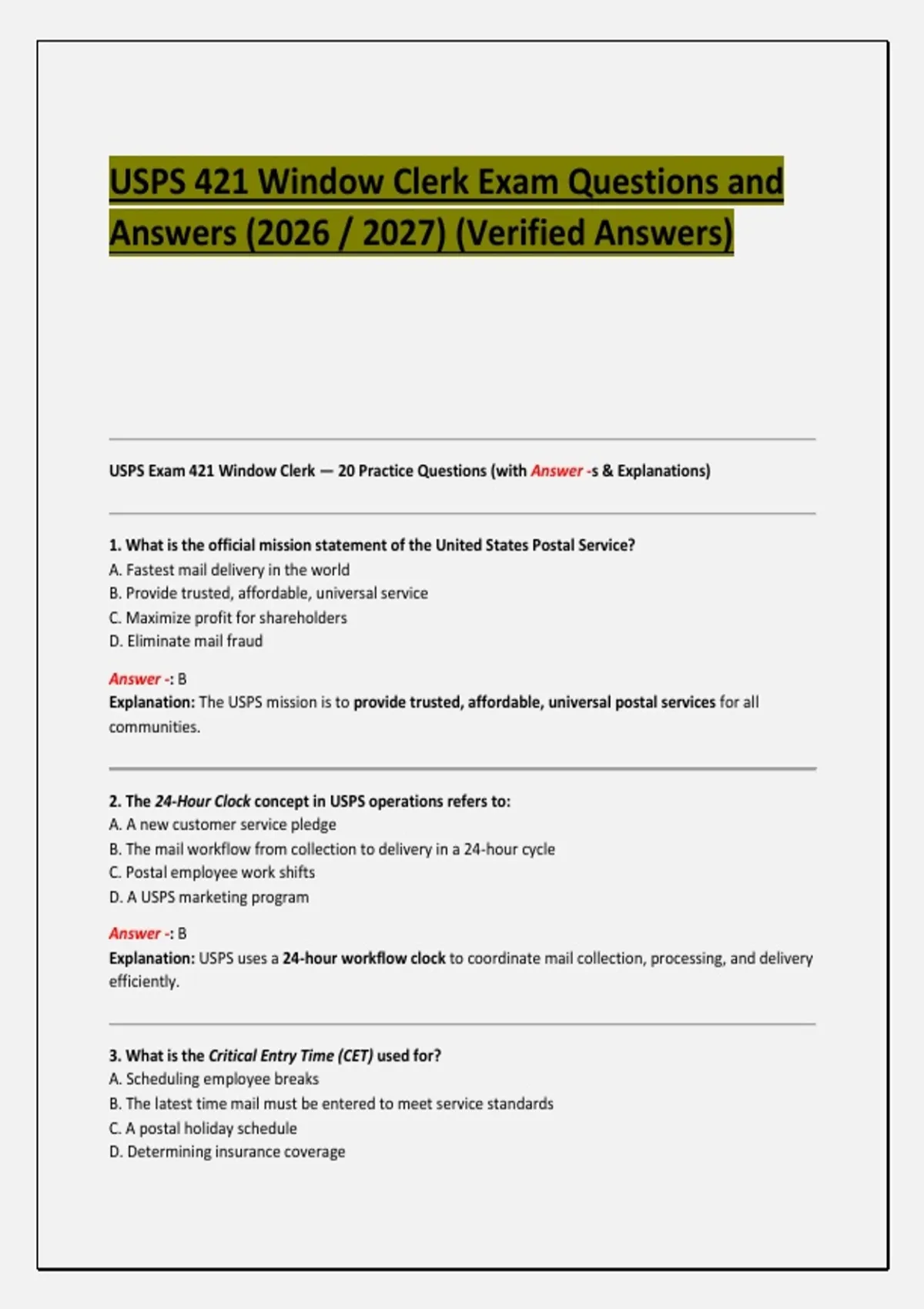 USPS Exam 421 Window Clerk — 20 Practice Questions (with Answer -s & Explanations)