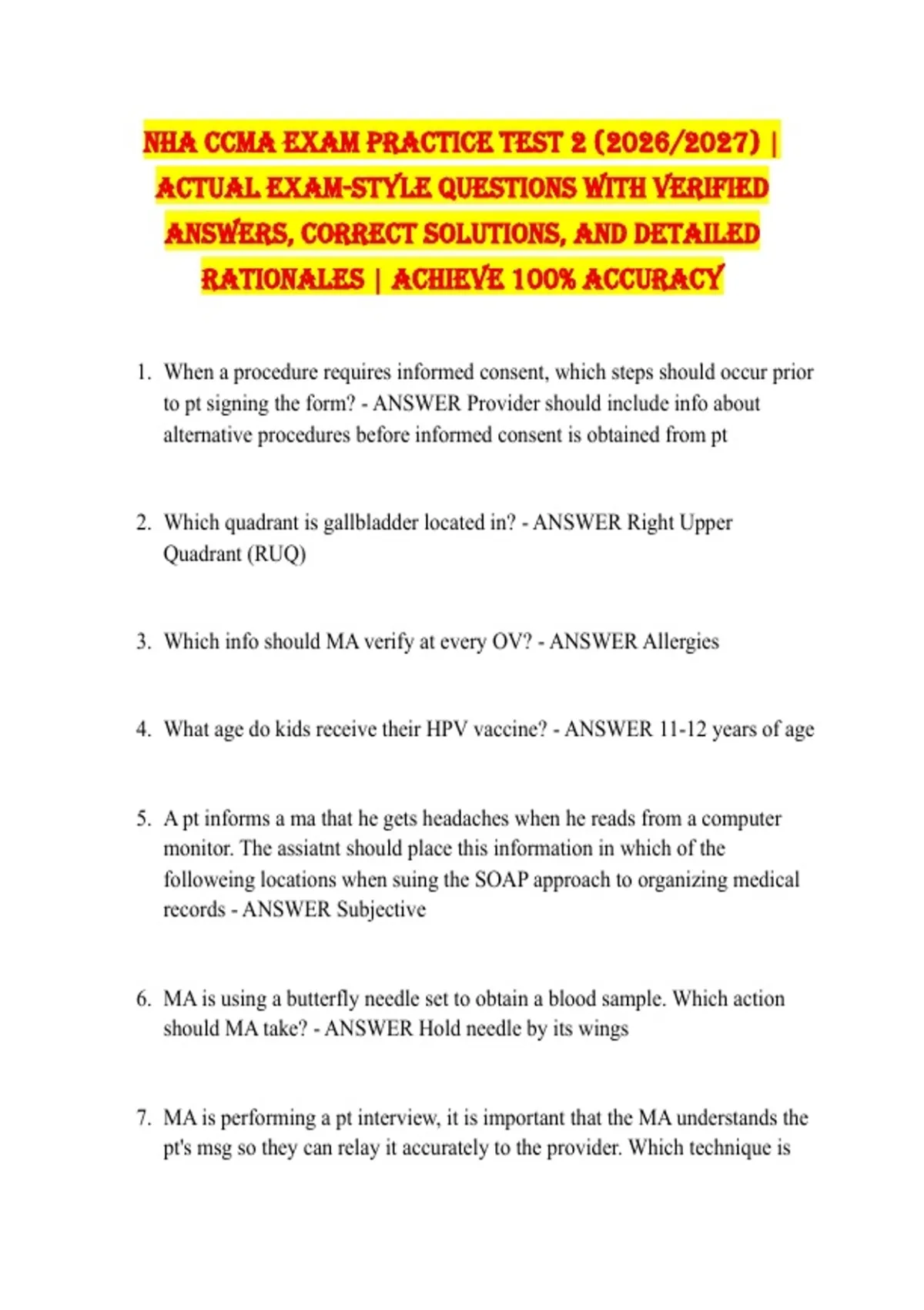 NHA CCMA Exam Practice Test 2 (2026/2027) | Actual Exam-Style Questions with Verified Answers, Correct Solutions, and Detailed Rationales | Achieve 100% Accuracy 1. When a procedure requires informed consent, which steps should occur prior to pt signing the form? - ANSWER Provider should include info about alternative procedures before informed consent is obtained from pt 2. Which quadrant is gallbladder located in? - ANSWER Right Upper Quadrant (RUQ) 3. Which info should MA verify at every OV? - ANSWER Allergies 4. What age do kids receive their HPV vaccine? - ANSWER 11-12 years of age 5. A pt informs a ma that he gets headaches when he reads from a computer monitor. The assiatnt should place this information in which of the followeing locations when suing the SOAP approach to organizing medical records - ANSWER Subjective 6. MA is using a butterfly needle set to obtain a blood sample. Which action should MA take? - ANSWER Hold needle by its wings 7. MA is performing a pt interview, it is important that the MA understands the pt's msg so they can relay it accurately to the provider. Which technique is the MA using when they state "I hear that you are saying...." - ANSWER Paraphrasing 8. Which action is within the scope of practice for a MA? - ANSWER Providing first aid procedures 9. MA is billing a patient's third party payer. Which document does this require? - ANSWER An 837P/CMS-1500 form 10. Which statement describes the doctrine of professional discretion? - ANSWER When a pt requests a copy of their medical records, the provider may choose not to disclose all of the pt information 11. Which supplies are required for proper handwashing technique? - ANSWER Paper towels 12. MA has a provider order to draw blood for an 18 month old toddler. Which site should the MA choose for the venipuncture? - ANSWER Superficial dorsal hand veins 13. MA experiences exposure to an infectious disease via human bite, which step should they take first? - ANSWER Immediately flush the exposed area 14. When performing surgical asepsis, which steps should a MA take to prevent contamination of the sterile field? - ANSWER Place all sterile items in the center of the sterile field 15. MA is administering an ID injection for allergy testing. Which action should MA take? - ANSWER Locate te middle portion of the anterior forearm 16. MA is processing a referral for a patient who has less than 6 months to live. Which facility will the MA refer the pt to? - ANSWER Hospice care facility 17. Which part of Medicare covers DME? - ANSWER Part B 18. Overwhelming experiences often cause which condition? - ANSWER Posttraumatic stress disorder (PTSD) 19. MA is preparing to perform capillary puncture from a pt who has poor circulation in their hands. which technique should MA use to increase circulation? - ANSWER Warm the pt's hand 20. MA is collecting forensic specimen at the request of an employer. Which of the following people should sign the documentation for the specimen, according to the chain of custody protocol? - ANSWER All personnel that come in contact with the specimen 21. MA is creating templates for a provider to send electronic RX's. Which is the most commonly included in electronic prescription templates? - ANSWER The medication type 22. MA has acquired a pre auth for a pt's referral to a specialist. Which is the reason that the insurer may deny the claim submitted by the specialist? - ANSWER The specialist provided service after the expiration date of the preauthorization 23. MA is removing sutures from a patient, after setting up sterile field, which action should MA take? - ANSWER Grasp and lift the knot away from the skin 24. In venipuncture, which is the correct order of draw? - ANSWER Green, lavender, gray 25. MA is performing an EKG on pt, which describes the appropriate placement of the electrodes? - ANSWER Tabs downward on the arm 26. Which finger should MA choose for a capillary puncture on an adult? - ANSWER Middle finger 27. Which screening should the MA provide information about to the 45 year old female patient? - ANSWER Mammography screening 28. MA is preparing a patient for urine creatinine test. Over which periods of time should the assistant instruct the patient to collect the specimen? - ANSWER 24 hr 29. Which position should MA place patient when preparing to perform EKG in the office? - ANSWER Supine 30. Which term refers to the process of making sure the balance of a financial account matches the balance on a bank statement? - ANSWER Reconciliation 31. PRN stands for - ANSWER As needed 32. MA is helping provider with colposcopy procedure, which position should the MA place the pt? - ANSWER Lithotomy position 33. Adverse reaction - ANSWER Anaphylaxis 34. Who dictates the operations of physician office clinical laboratories? - ANSWER Centers for Medicare and Medicaid Services (CMS) 35. Which diagnostic statement is appropriate for outpatient setting? - ANSWER Fever of unknown origin 36. A snellen chart measures? - ANSWER Visual acuity 37. When obtaining BP, how high should MA inflate the cuff? - ANSWER Approximately 30 mm Hg above the previously measured radial pulse reading 38. what should PROVIDER do before informed consent is obtained from pt - ANSWER include information about ALTERNATIVE procedures 39. What should a medical assistant do after assisting with a biopsy? - ANSWER Place caps back on needles to reduce the risk of puncturing the sharps container and dispose of a scalpel in a properly labeled, puncture-proof container. 40. What should a patient do prior to gowning for a physical examination to ensure comfort? - ANSWER Have the patient empty their bladder. 41. What condition can cause a pulse oximeter to register an artificially low oxygen saturation? - ANSWER Cold fingers. 42. What type of scheduling involves scheduling three patients at the top of each hour to be seen in the order they arrive? - ANSWER Wave scheduling. 43. Which cell structure provides energy for cells? - ANSWER