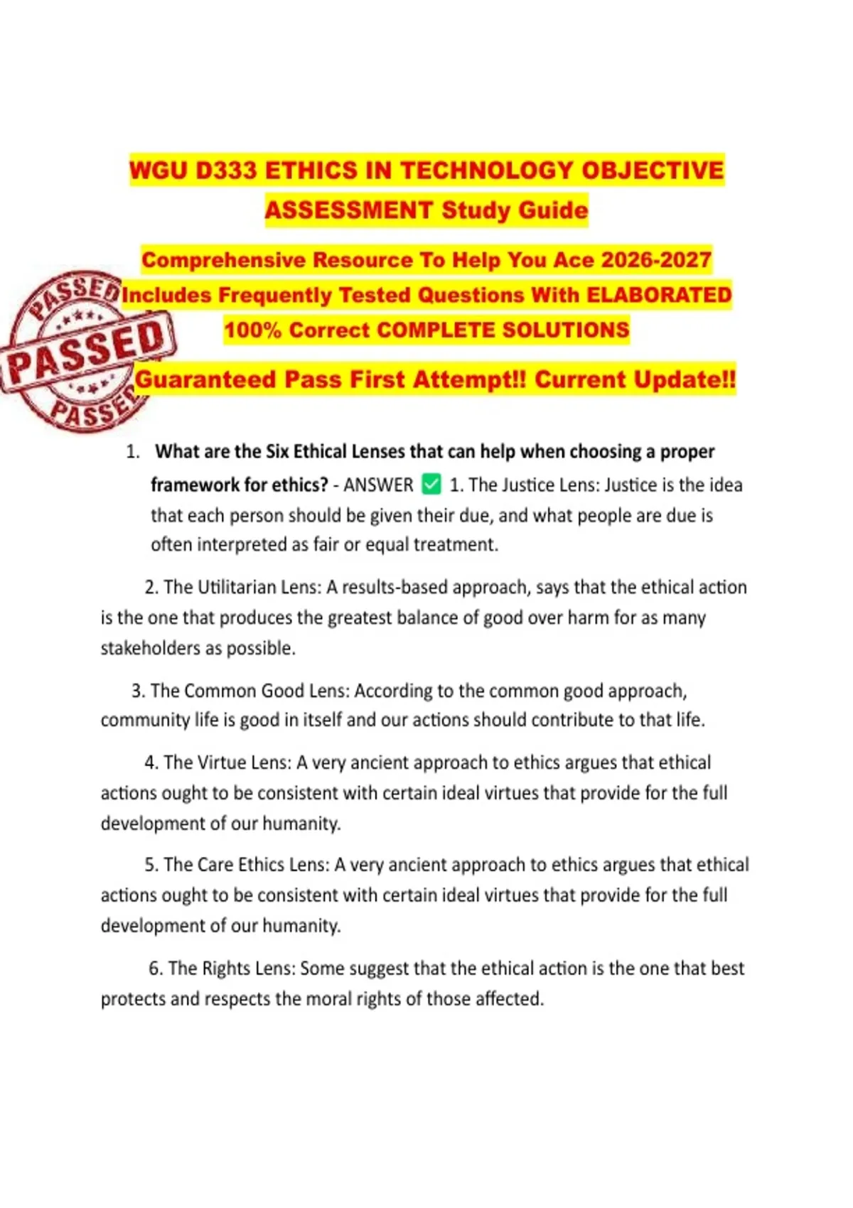 framework for ethics? - ANSWER 1. The Justice Lens: Justice is the idea