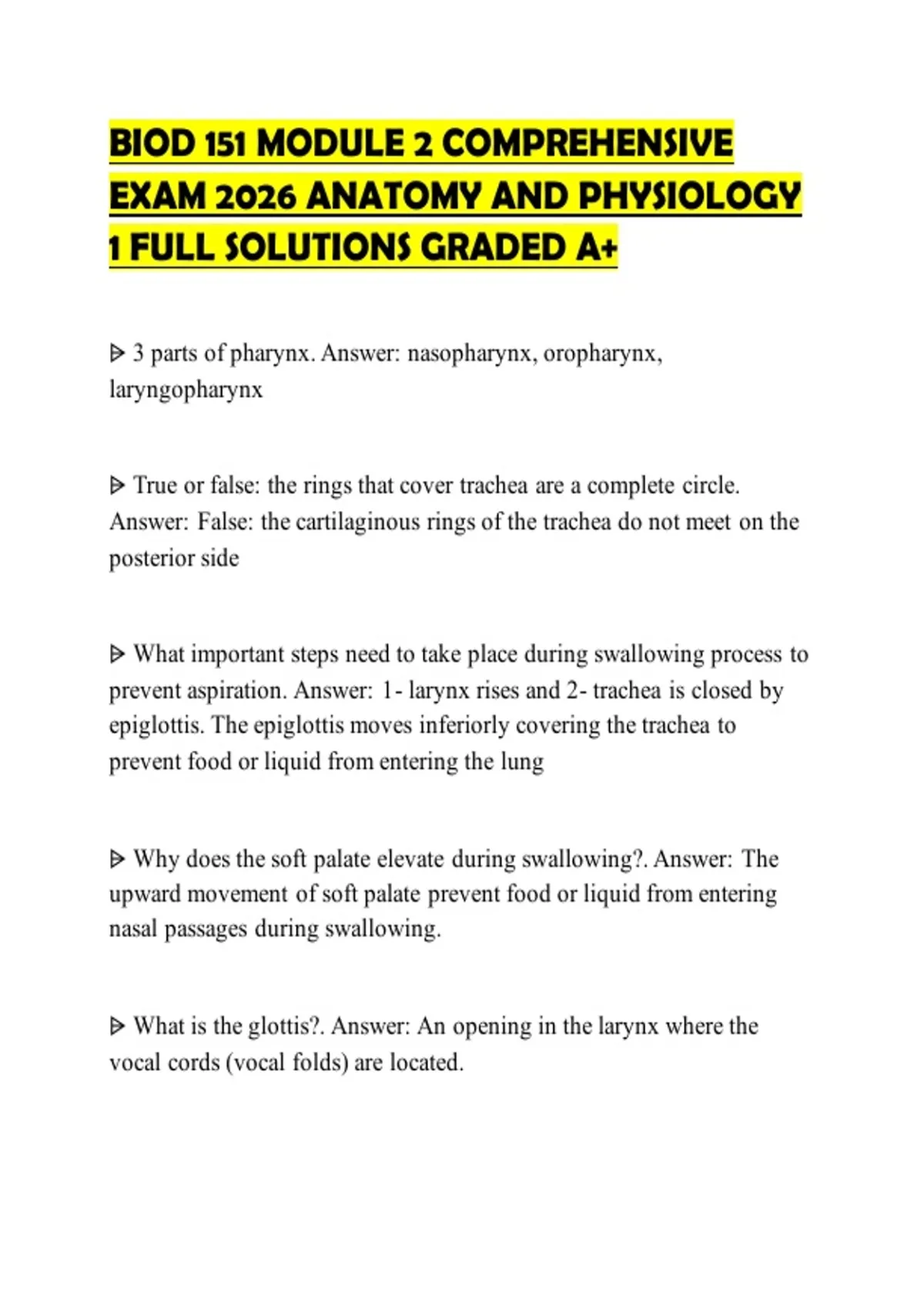 IOD 151 MODULE 2 COMPREHENSIVE EXAM 2026 ANATOMY AND PHYSIOLOGY 1 FULL SOLUTIONS GRADED A+