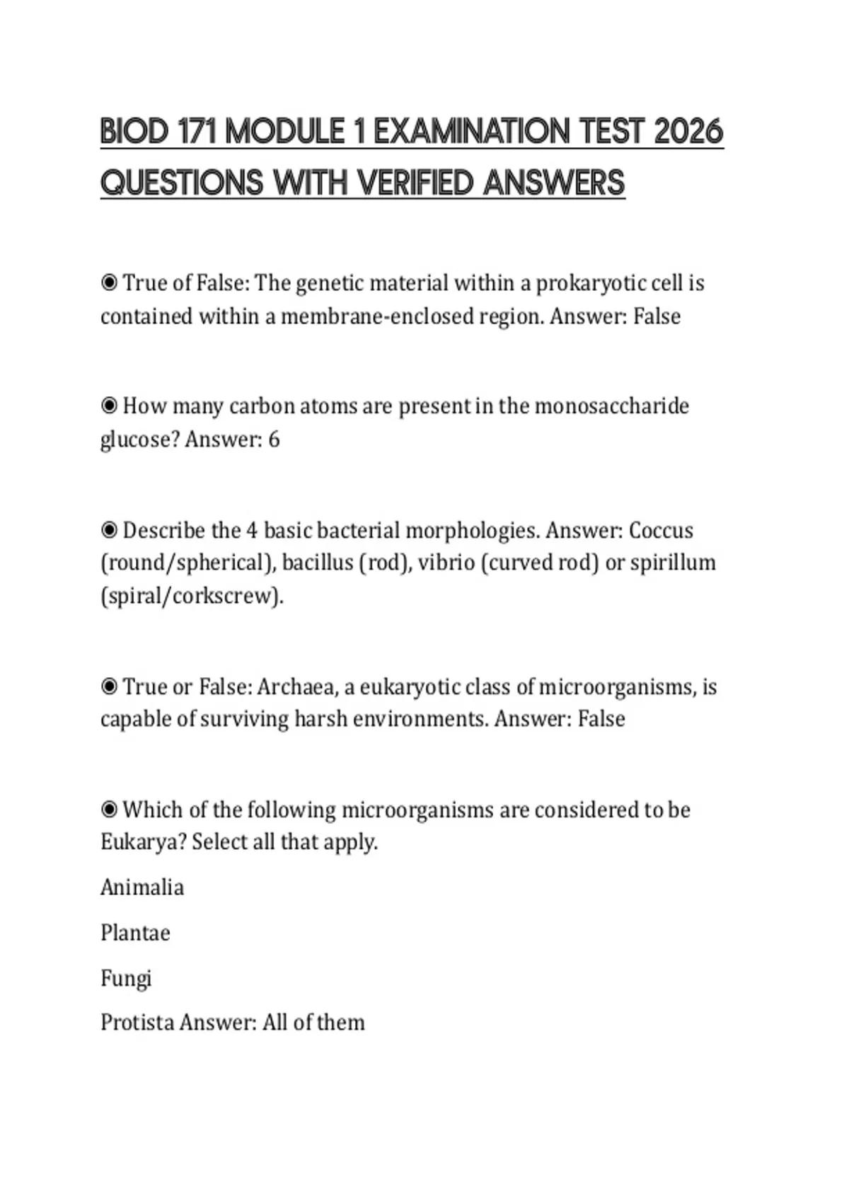 BIOD 171 MODULE 1 EXAMINATION TEST 2026 QUESTIONS WITH VERIFIED ANSWERS