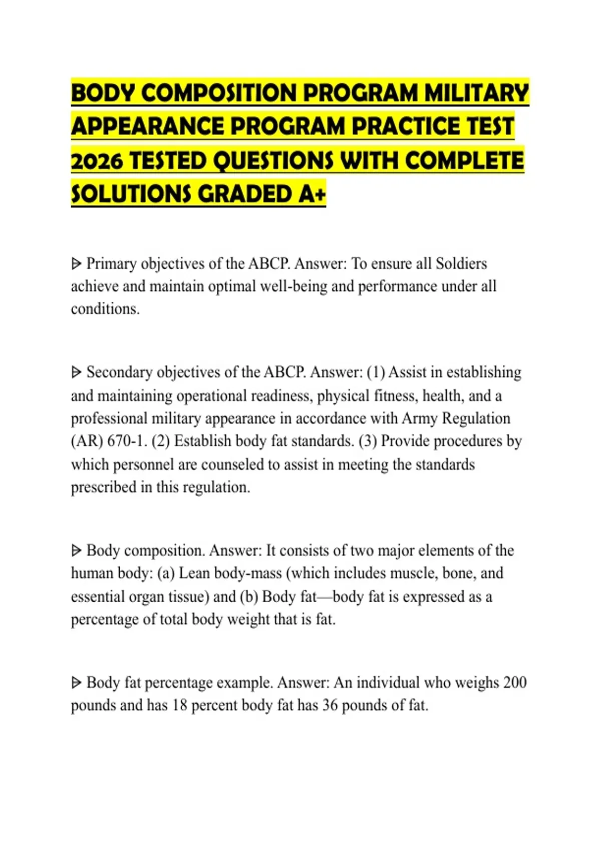 BODY COMPOSITION PROGRAM MILITARY APPEARANCE PROGRAM PRACTICE TEST 2026 TESTED QUESTIONS WITH COMPLETE SOLUTIONS GRADED A+