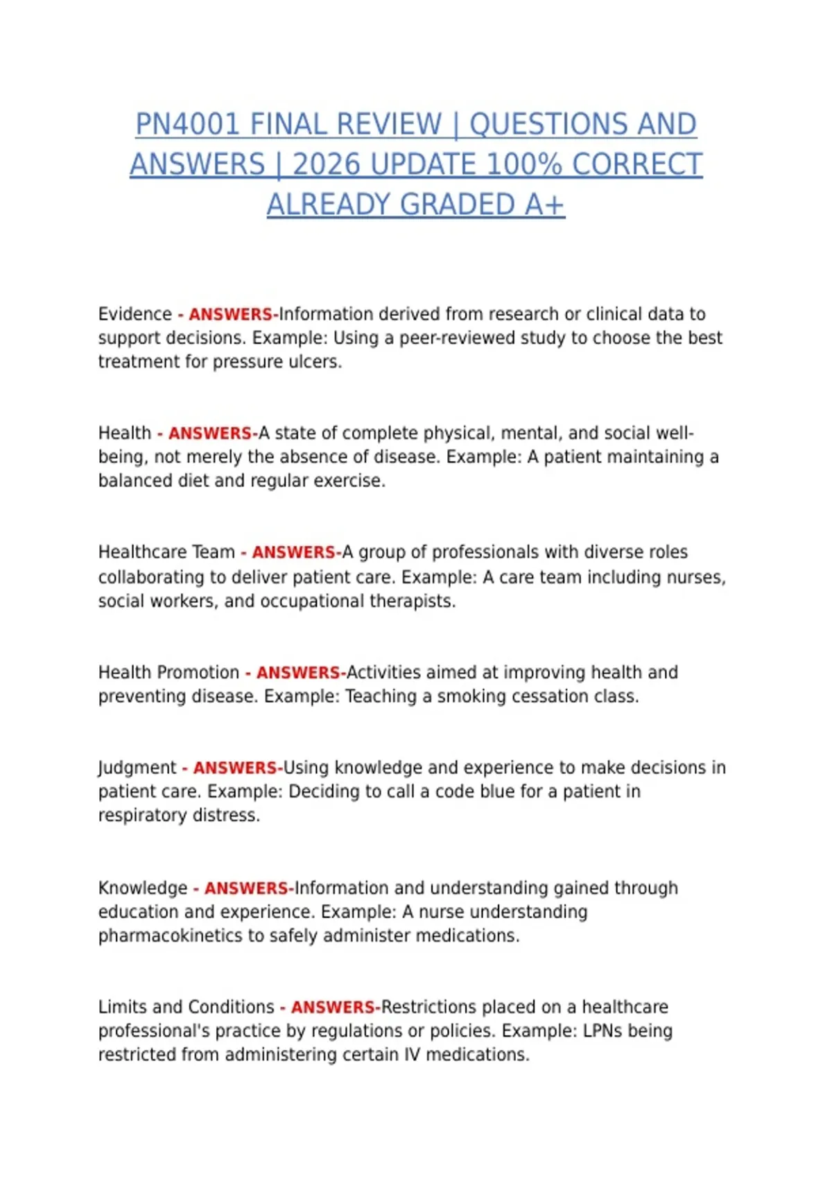 This document provides a comprehensive PN4001 Final Exam Review for the 2026 academic year, featuring carefully selected exam-focused questions with 100% correct, fully verified solutions. It is designed to help students thoroughly prepare for the PN4001 final examination by reinforcing key concepts and commonly tested topics. All questions have been accurately answered and reviewed, ensuring reliability, clarity, and alignment with current course objectives and university examination standards. The material reflects real exam structures and problem-solving approaches frequently assessed in PN4001 final exams.