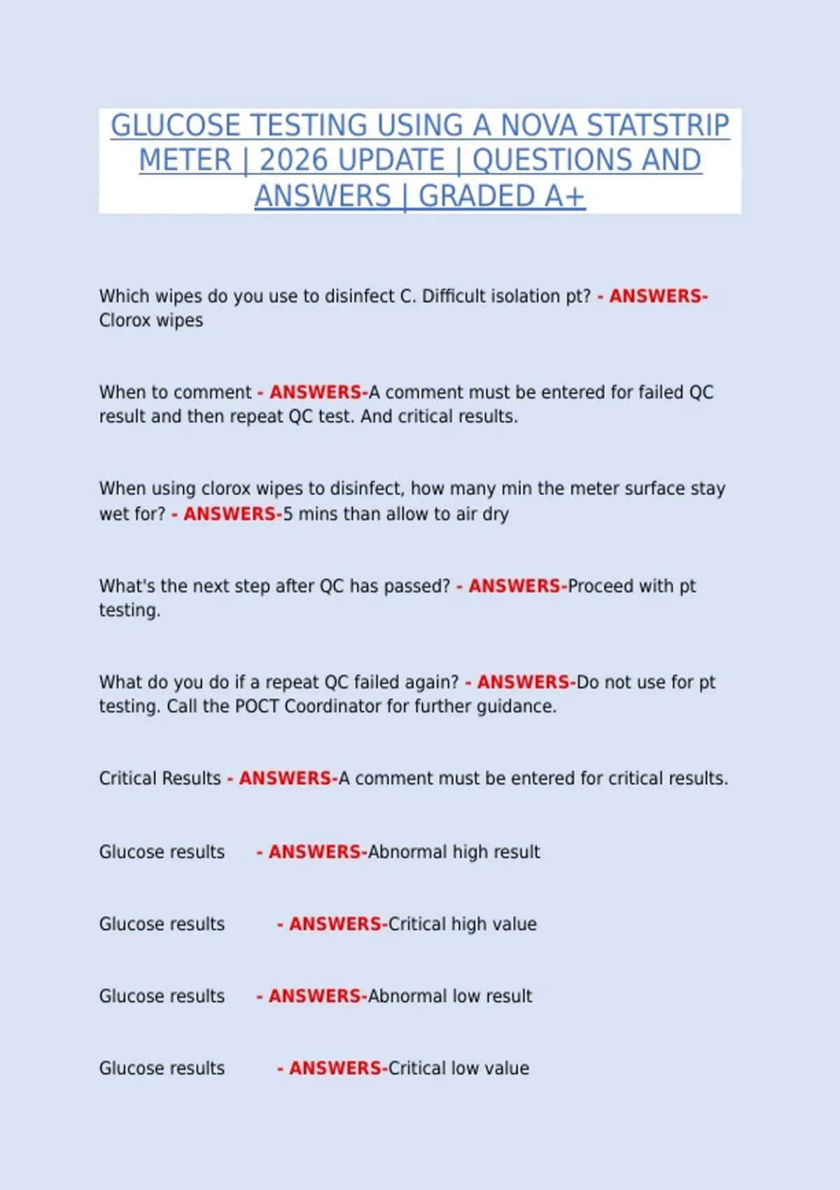 This document provides a comprehensive review of glucose testing using a Nova StatStrip Meter, updated for 2026, and designed for students and healthcare trainees preparing for clinical skills assessments, competency evaluations, and practical examinations. It includes exam-focused questions with fully verified, accurate answers, covering the correct procedure, safety protocols, and clinical best practices required when performing point-of-care blood glucose testing with the Nova StatStrip system. All content has been reviewed for accuracy and reflects current clinical guidelines and training standards.