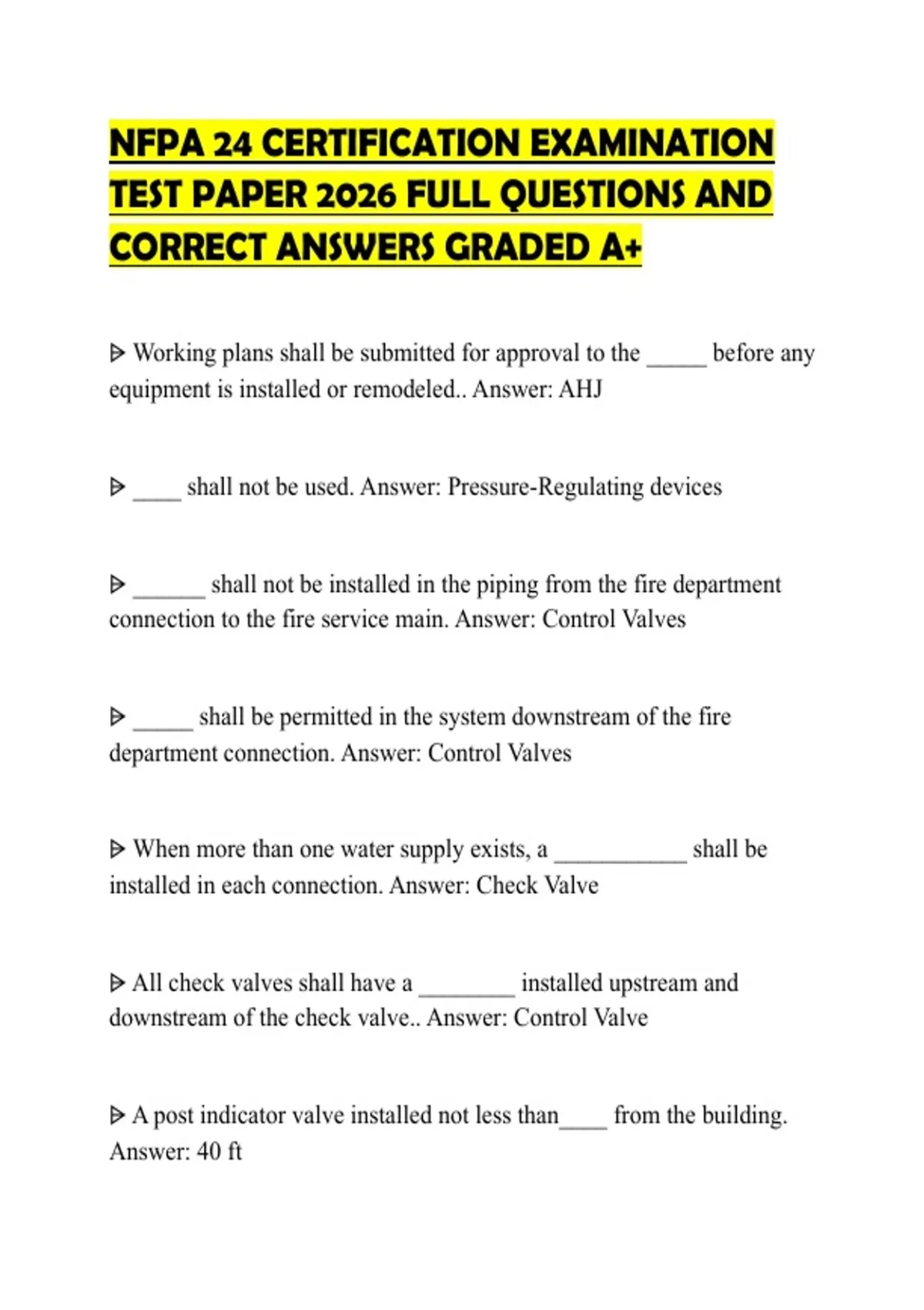 NFPA 24 CERTIFICATION EXAMINATION TEST PAPER 2026 FULL QUESTIONS AND CORRECT ANSWERS GRADED A+