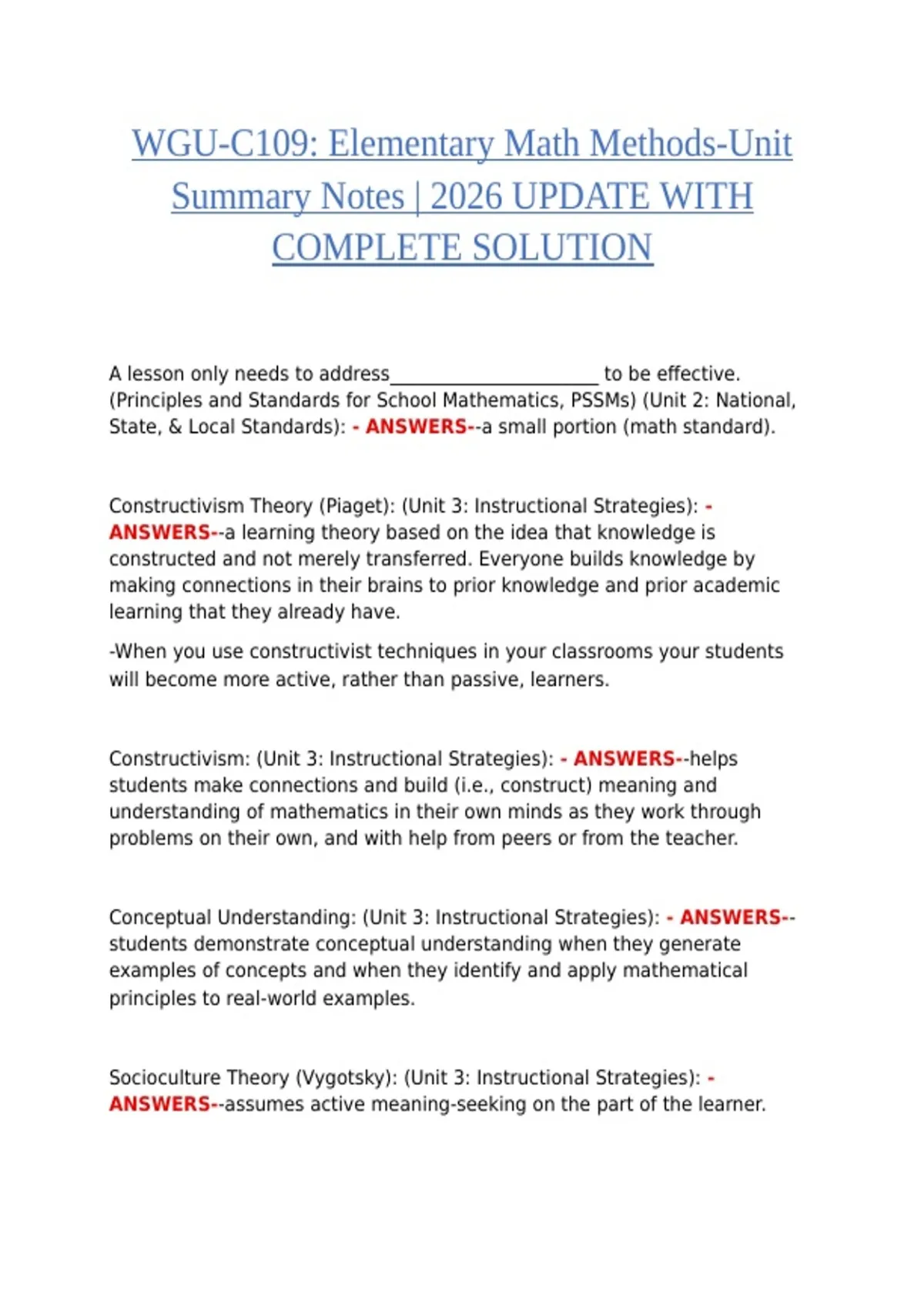 This document provides a comprehensive summary of WGU C109 – Elementary Math Methods for 2026, featuring unit-by-unit notes with fully verified, step-by-step solutions. It is designed to help students understand fundamental math concepts, reinforce key teaching strategies, and excel in coursework and assessments. All notes and solutions have been carefully reviewed and verified, ensuring alignment with current WGU C109 course objectives, elementary math standards, and instructional methods. The material is ideal for self-study, focused revision, and exam preparation.