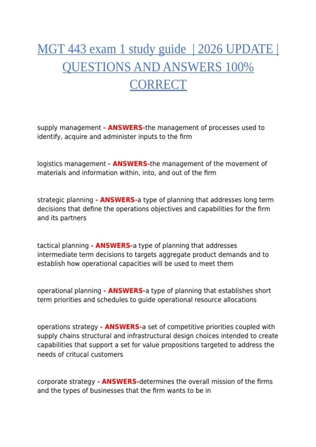 MGT 443 Exam 1 Study Guide (2026 Edition) – Complete Questions & Verified Solutions | 100% Correct