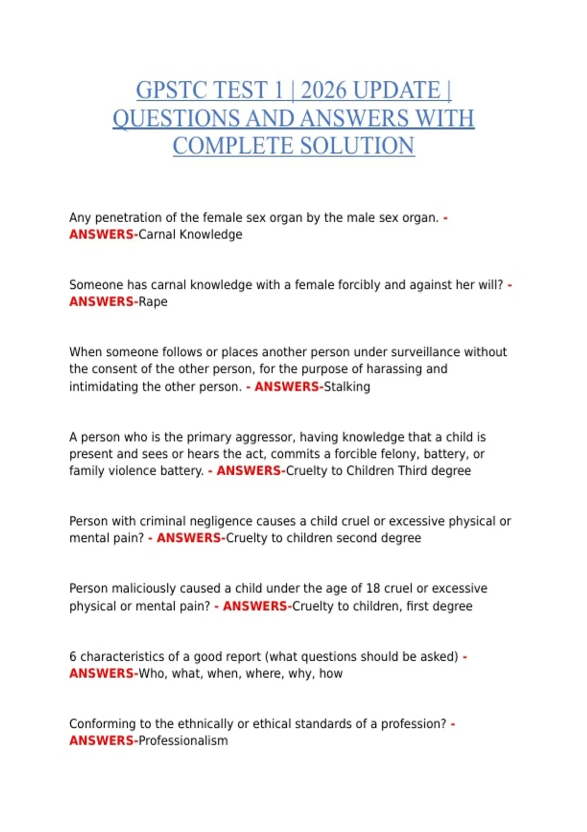 This document provides a comprehensive review of GPSTC Test 1 for 2026, featuring exam-style questions with fully verified, step-by-step solutions. It is designed to help law enforcement trainees prepare effectively, reinforce critical knowledge, and achieve top performance on the test. All questions and solutions have been carefully reviewed and verified, ensuring alignment with current GPSTC training standards, procedures, and assessment requirements. The material is ideal for self-study, focused revision, and exam preparation.