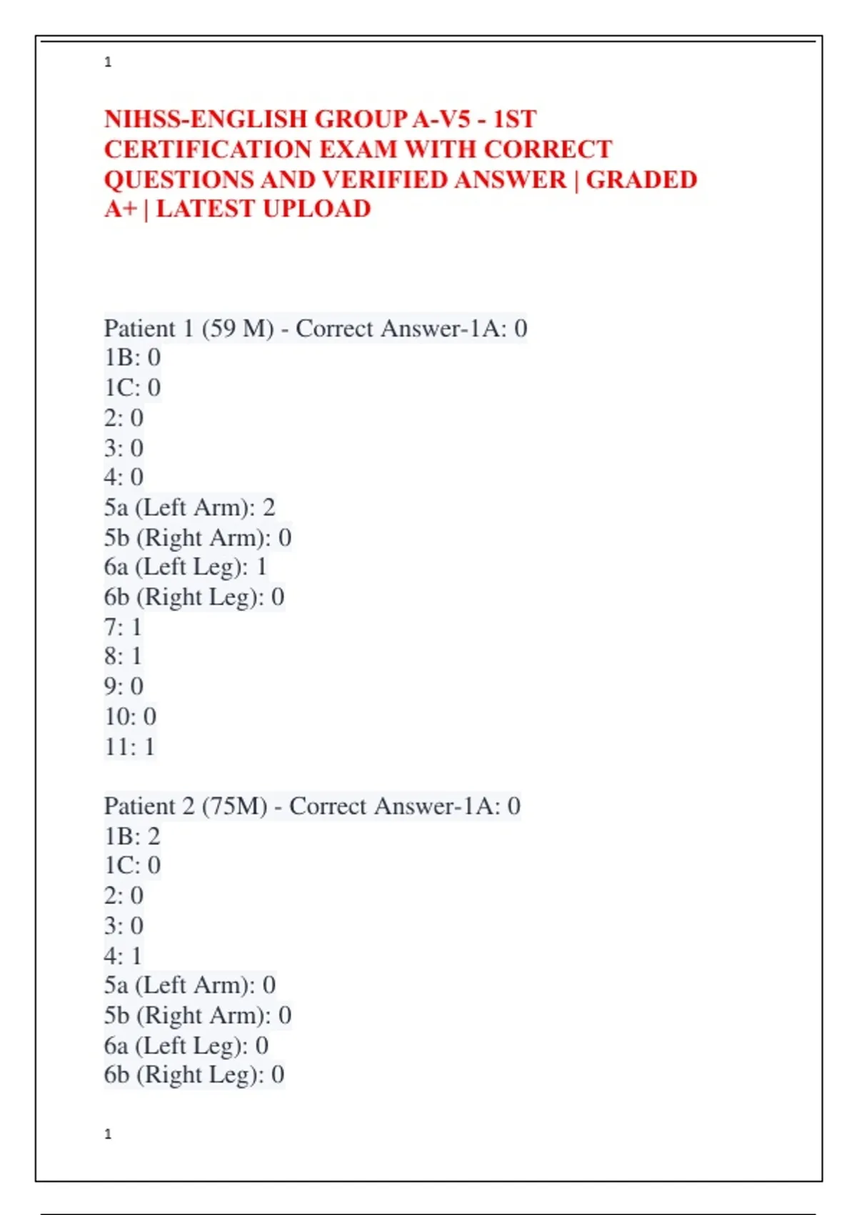 NIHSS-ENGLISH GROUP A-V5 - 1ST CERTIFICATION EXAM WITH CORRECT QUESTIONS AND VERIFIED ANSWER | GRADED A+ | LATEST UPLOAD