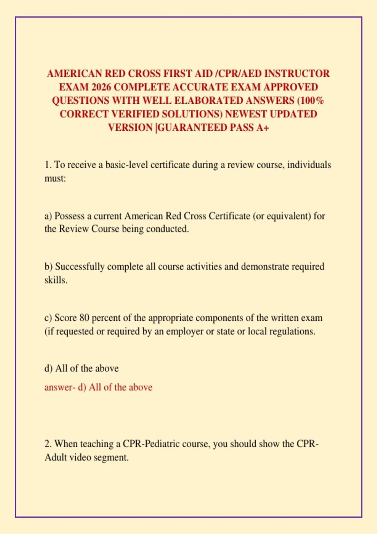 AMERICAN RED CROSS FIRST AID /CPR/AED INSTRUCTOR EXAM 2026 COMPLETE ACCURATE EXAM APPROVED QUESTIONS WITH WELL ELABORATED ANSWERS (100% CORRECT VERIFIED SOLUTIONS) NEWEST UPDATED VERSION |GUARANTEED PASS A+