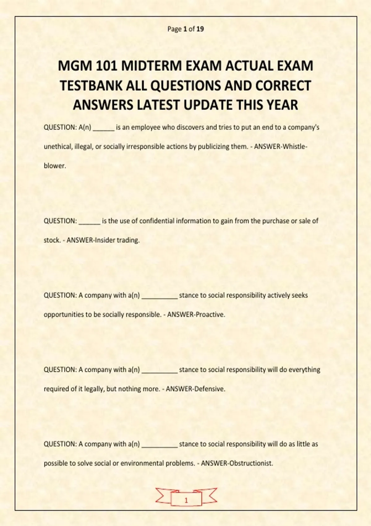 Tap on AVAILABLE IN BUNDLE / PACKAGE DEAL to unlock free bonus exams — save more while getting everything you need! You’ll be glad you did! The MGM 101 Midterm Exam Test Bank – Actual Exam Questions and Correct Answers (Latest Update This Year) delivers a fully updated and comprehensive collection of verified questions designed to help candidates confidently prepare for the MGM 101 midterm examination. This in-depth study resource covers essential topics including foundational management principles, organizational behavior, leadership strategies, business operations, marketing fundamentals, financial decision-making, ethical and legal considerations, and problem-solving techniques. Each question includes the correct answer to reinforce understanding, strengthen analytical reasoning, and enhance exam readiness. Ideal for management students, business professionals, and individuals preparing for the MGM 101 Midterm Exam, this exam prep guide ensures thorough preparation and confident performance.