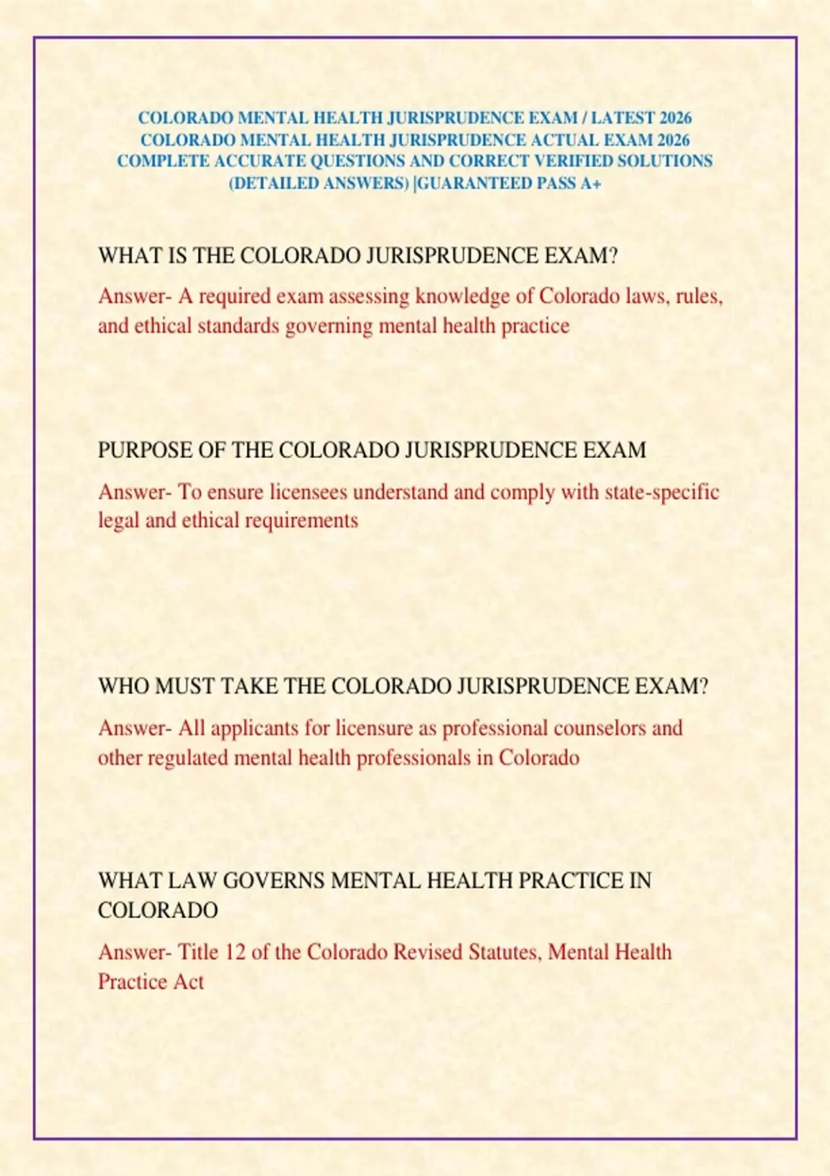 COLORADO MENTAL HEALTH JURISPRUDENCE EXAM / LATEST 2026 COLORADO MENTAL HEALTH JURISPRUDENCE ACTUAL EXAM 2026 COMPLETE ACCURATE QUESTIONS AND CORRECT VERIFIED SOLUTIONS (DETAILED ANSWERS) |GUARANTEED PASS A+