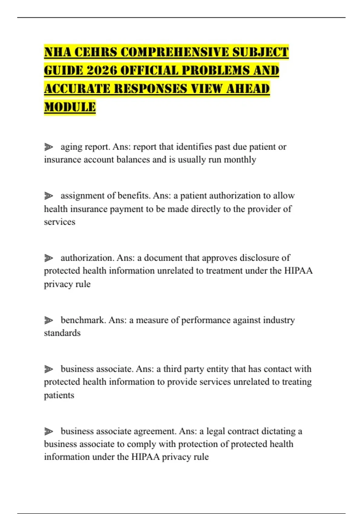 NHA CEHRS COMPREHENSIVE SUBJECT GUIDE 2026 OFFICIAL PROBLEMS AND ACCURATE RESPONSES VIEW AHEAD MODULE