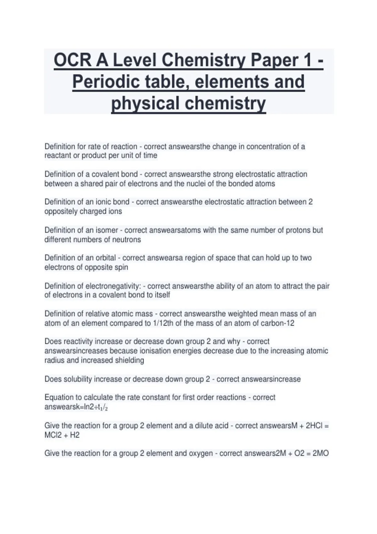 Give the reaction for a group 2 element and a dilute acid - correct answearsM + 2HCl =