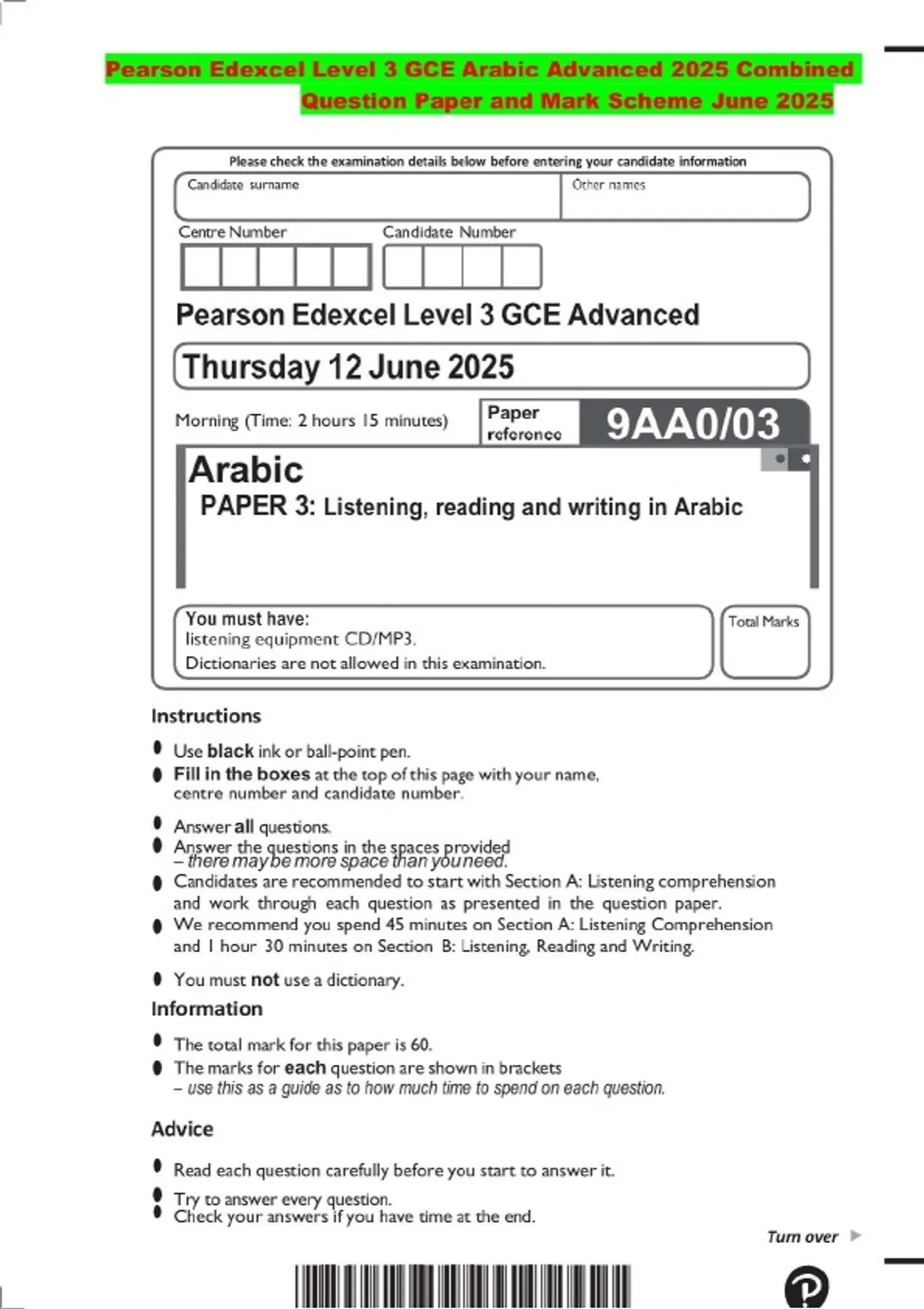 Pearson Edexcel Level 3 GCE Arabic Advanced 2025 Combined Question Paper and Mark Scheme June 2025