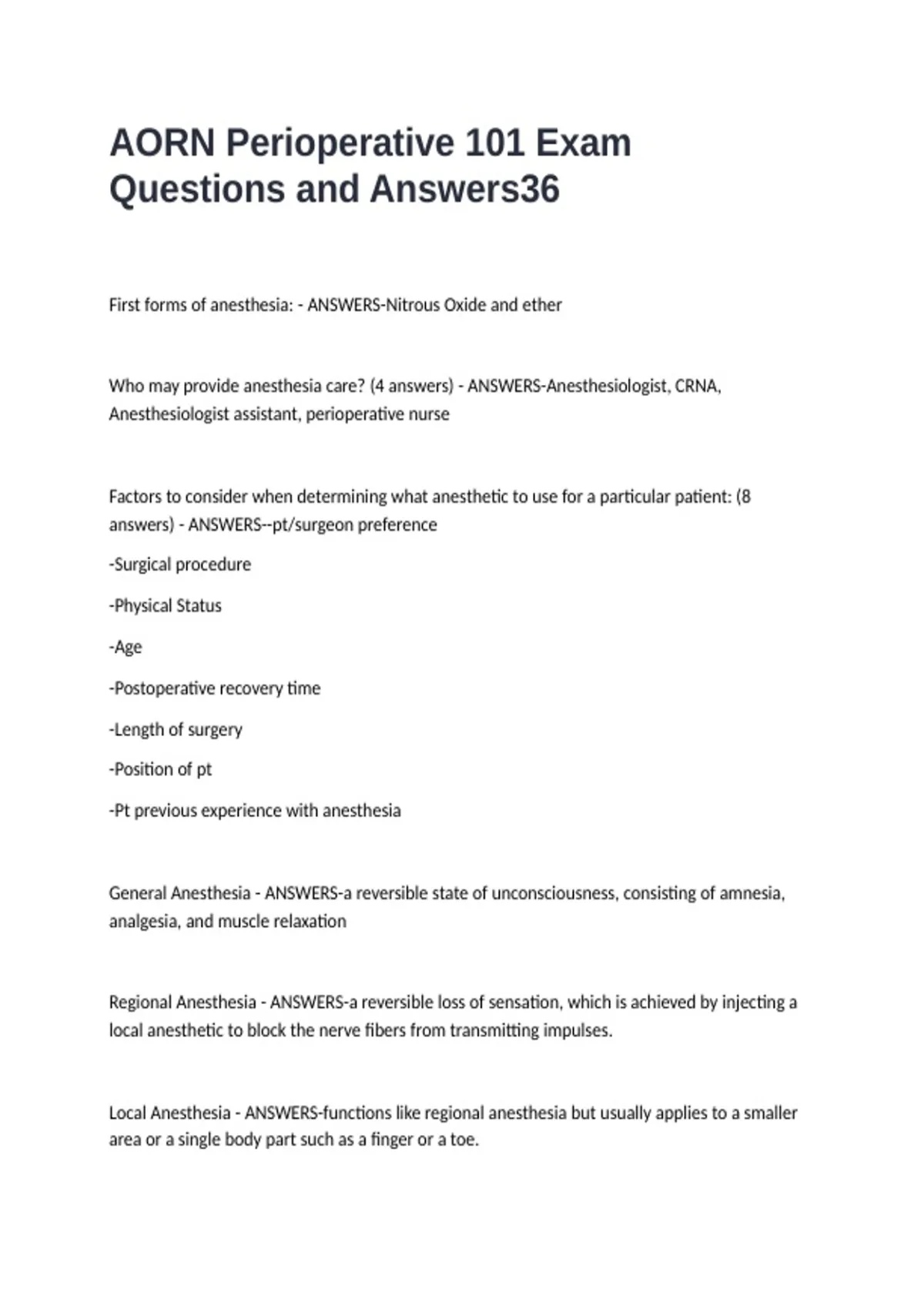 Local Anesthesia - ANSWERS-functions like regional anesthesia but usually applies to a smaller