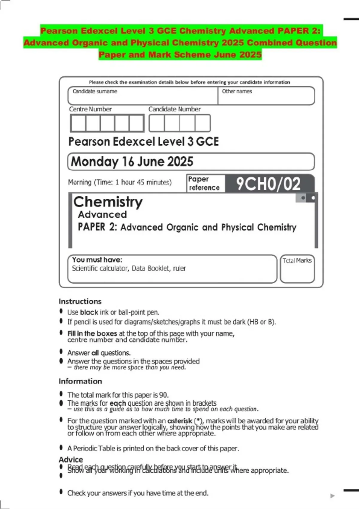 Pearson Edexcel Level 3 GCE Chemistry Advanced PAPER 2: Advanced Organic and Physical Chemistry 2025 Combined Question Paper and Mark Scheme June 2025