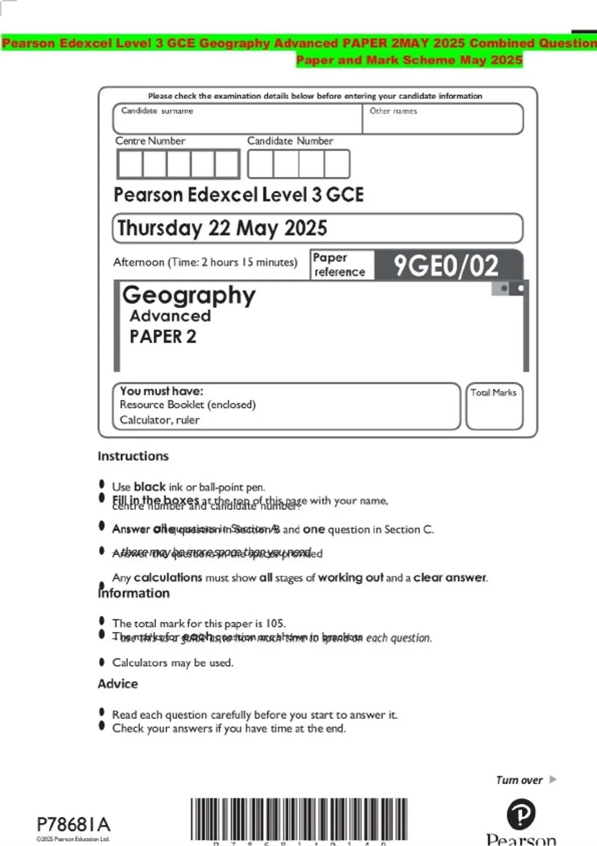 BUNDLE:::Pearson Edexcel Level 3 GCE Geography 2025 Combined Question Paper and Mark Scheme