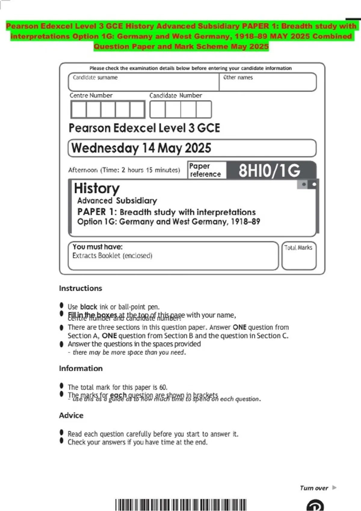 Pearson Edexcel Level 3 GCE History Advanced Subsidiary PAPER 1: Breadth study with interpretations Option 1G: Germany and West Germany, 1918–89 MAY 2025 Combined Question Paper and Mark Scheme May 2025