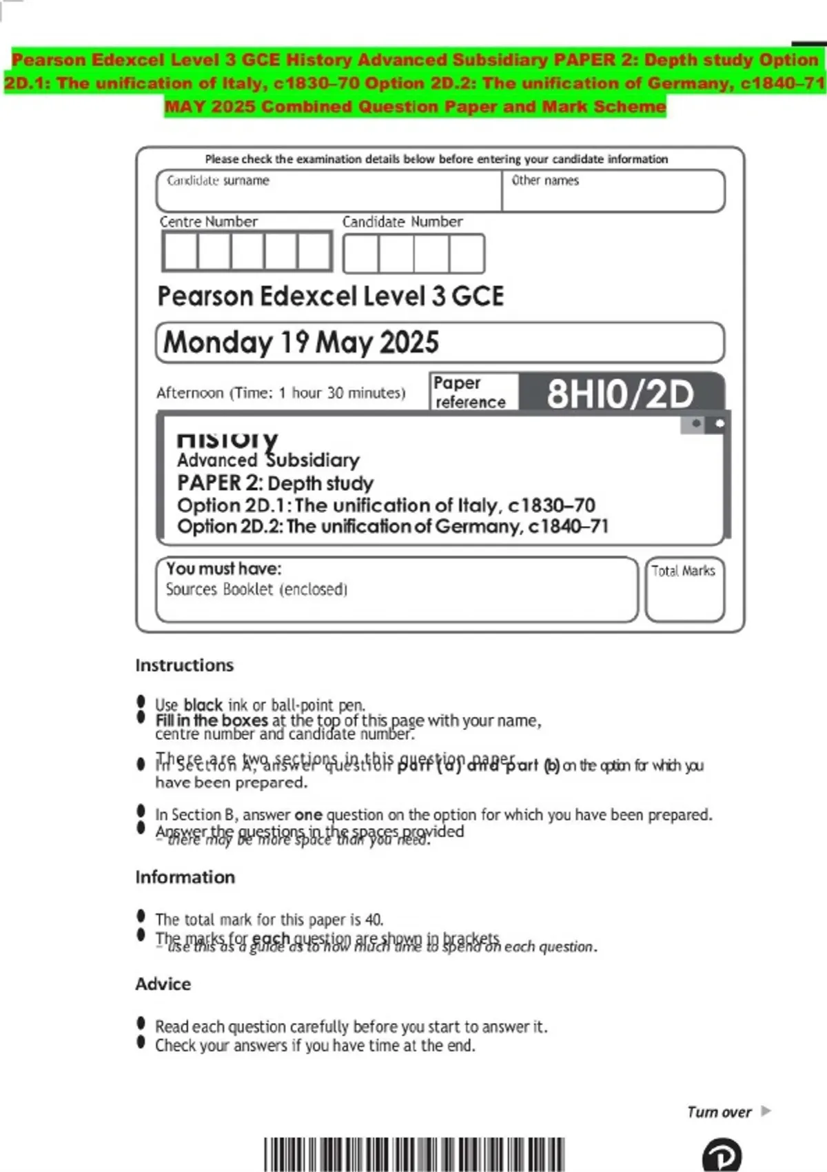 Pearson Edexcel Level 3 GCE History Advanced Subsidiary PAPER 2: Depth study Option 2D.1: The unification of Italy, c1830–70 Option 2D.2: The unification of Germany, c1840–71 MAY 2025 Combined Question Paper and Mark Scheme