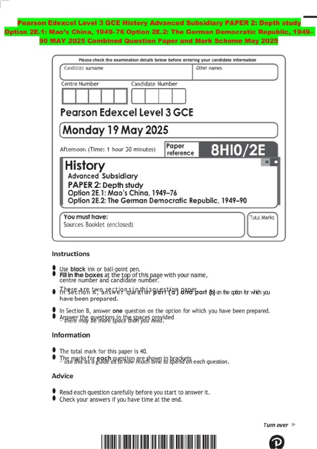 Pearson Edexcel Level 3 GCE History Advanced Subsidiary PAPER 2: Depth study Option 2E.1: Mao’s China, 1949–76 Option 2E.2: The German Democratic Republic, 1949– 90 MAY 2025 Combined Question Paper and Mark Scheme May 2025