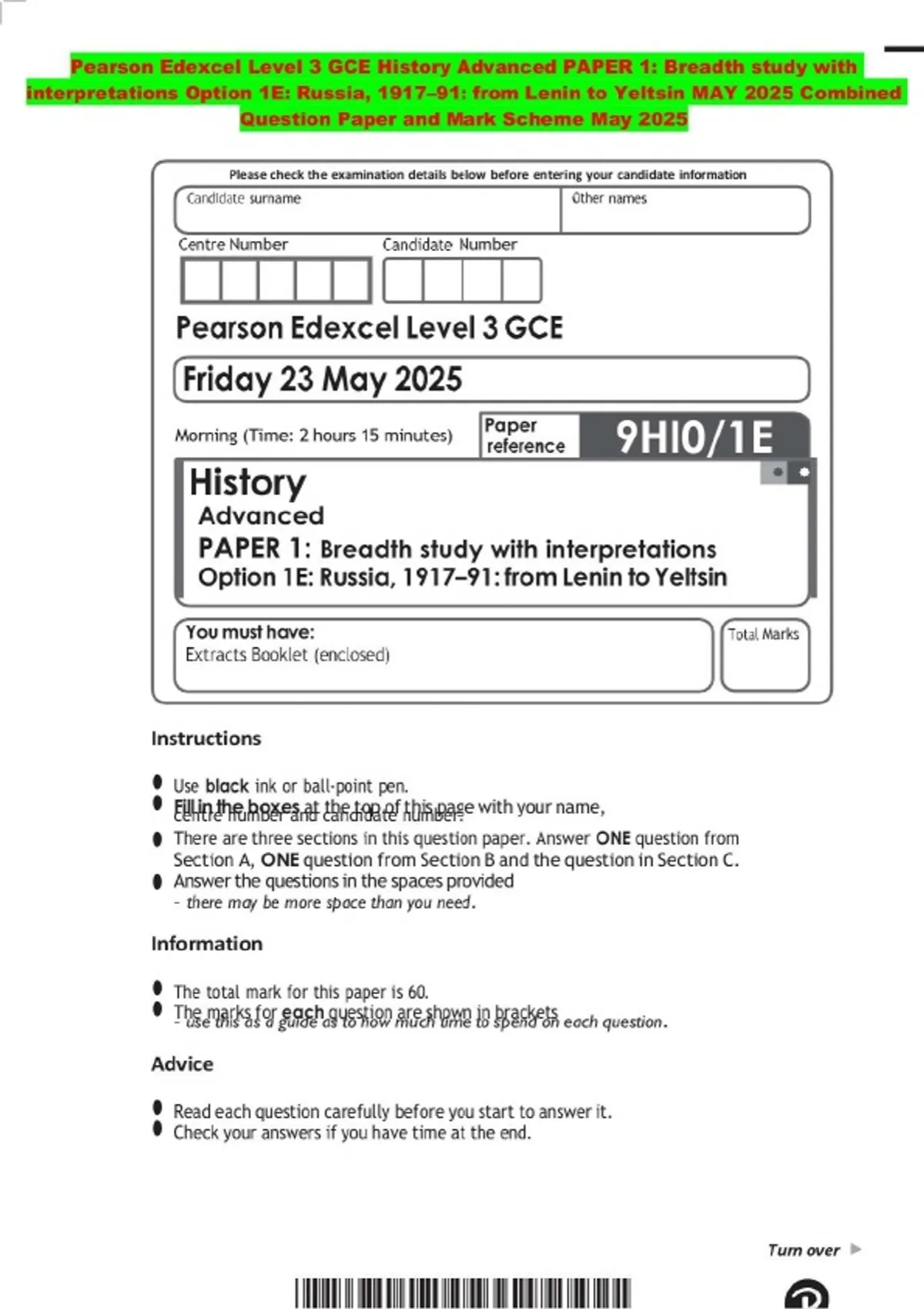 Pearson Edexcel Level 3 GCE History Advanced PAPER 1: Breadth study with interpretations Option 1E: Russia, 1917–91: from Lenin to Yeltsin MAY 2025 Combined Question Paper and Mark Scheme May 2025