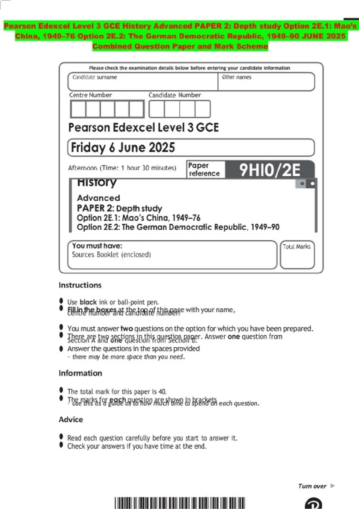 Pearson Edexcel Level 3 GCE History Advanced PAPER 2: Depth study Option 2E.1: Mao’s China, 1949–76 Option 2E.2: The German Democratic Republic, 1949–90 JUNE 2025 Combined Question Paper and Mark Scheme
