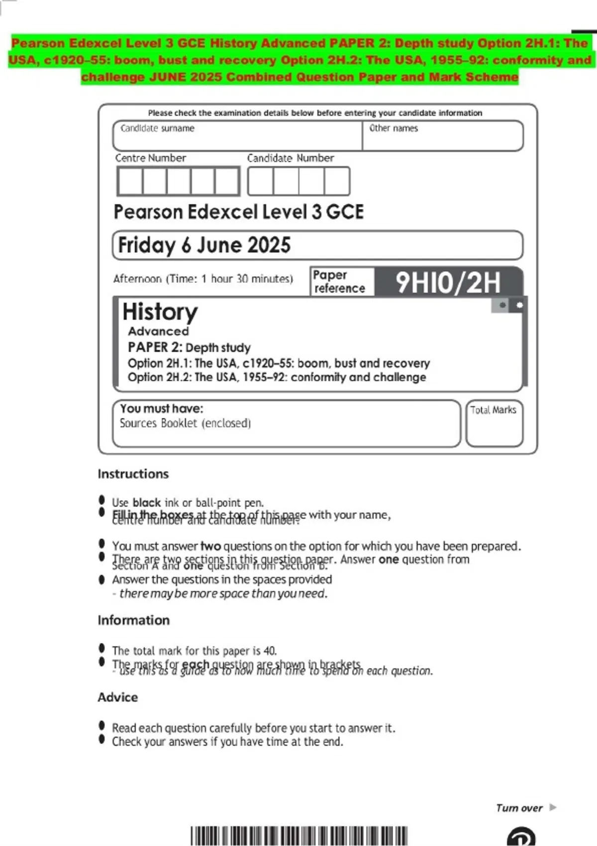 Pearson Edexcel Level 3 GCE History Advanced PAPER 2: Depth study Option 2H.1: The USA, c1920–55: boom, bust and recovery Option 2H.2: The USA, 1955–92: conformity and challenge JUNE 2025 Combined Question Paper and Mark Scheme
