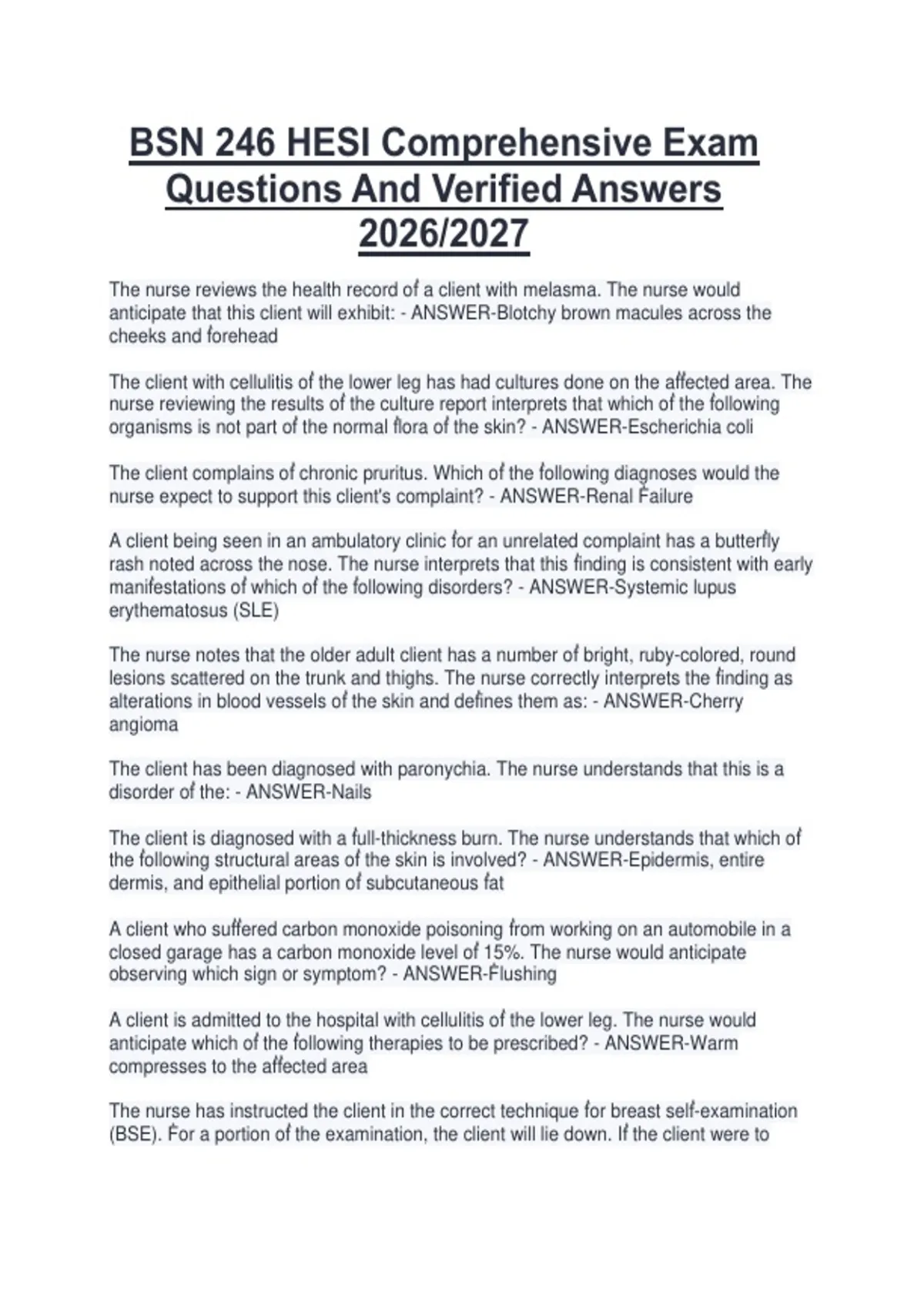 This document contains comprehensive exam questions and verified answers for BSN 246 HESI. It covers all key nursing topics including patient care, health assessment, clinical decision-making, prioritization, delegation, and professional standards relevant to the 2026/2027 exam period. The material is designed for complete exam review and to support thorough preparation for the HESI Comprehensive Exam.