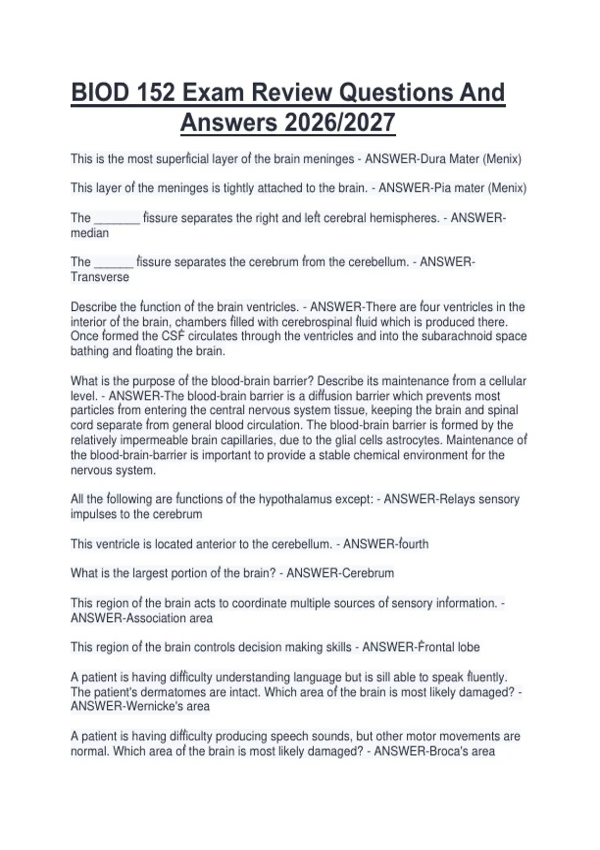 BIOD 152 Exam Review Questions And Answers 2026/2027