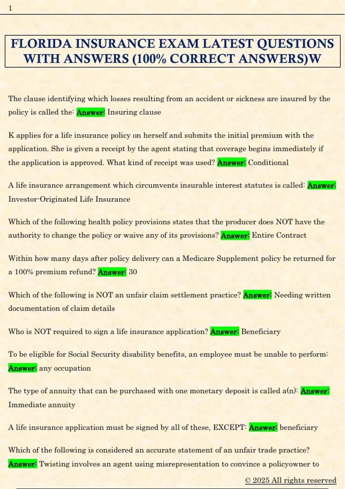 FLORIDA INSURANCE EXAM LATEST QUESTIONS WITH ANSWERS (100% CORRECT ANSWERS)