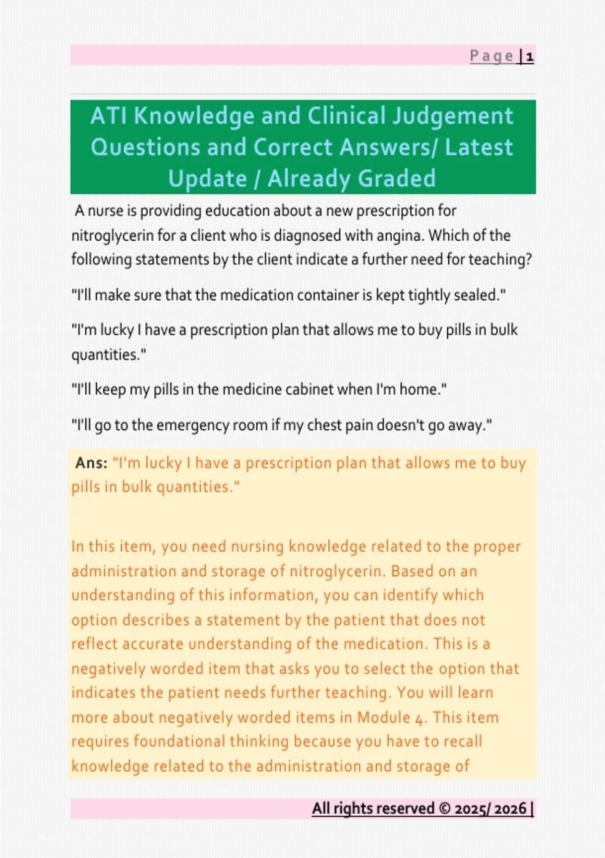 nitroglycerin for a client who is diagnosed with angina. Which of the