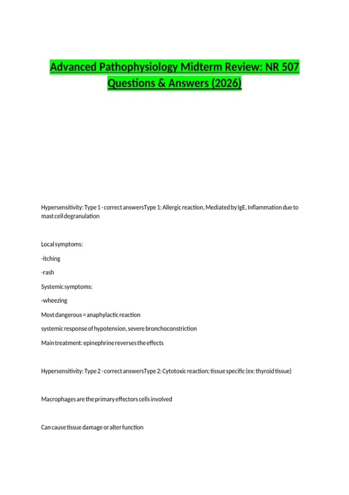 Advanced Pathophysiology Midterm Review: NR 507