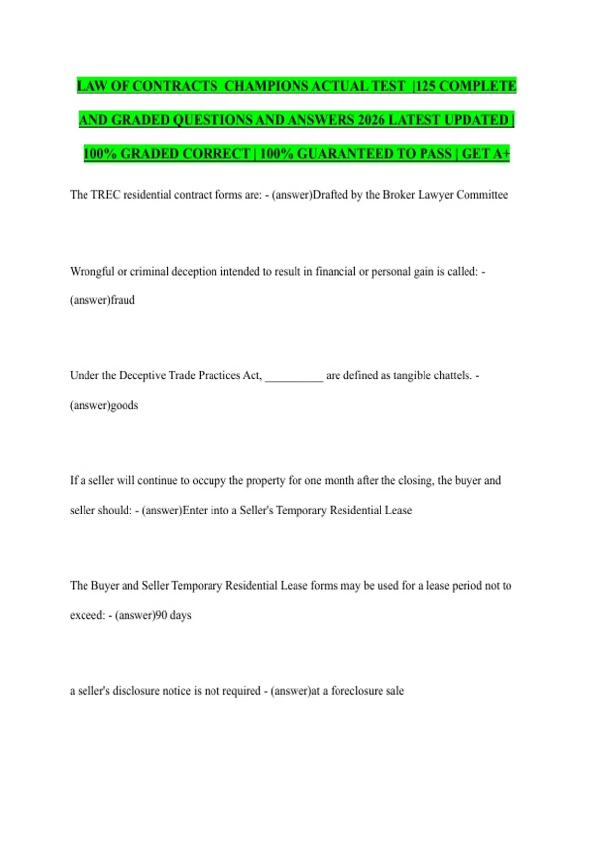 LAW OF CONTRACTS CHAMPIONS ACTUAL TEST |125 COMPLETE AND GRADED QUESTIONS AND ANSWERS 2026 LATEST UPDATED | 100% GRADED CORRECT | 100% GUARANTEED TO PASS | GET A+
