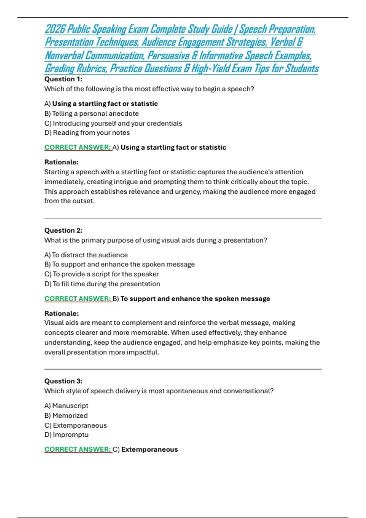 This 2026-updated Public Speaking Exam guide is a comprehensive resource designed to help students excel in both written and oral assessments. It covers speech preparation, structure, delivery techniques, audience analysis, persuasive and informative speech strategies, verbal and nonverbal communication, and common evaluation rubrics. The guide includes practice questions, sample speeches, tips for overcoming anxiety, and high-yield strategies to boost confidence, improve grades, and ensure success in exams and presentations. Ideal for students seeking efficient revision, practical application, and stronger performance in public speaking courses throughout 2026.