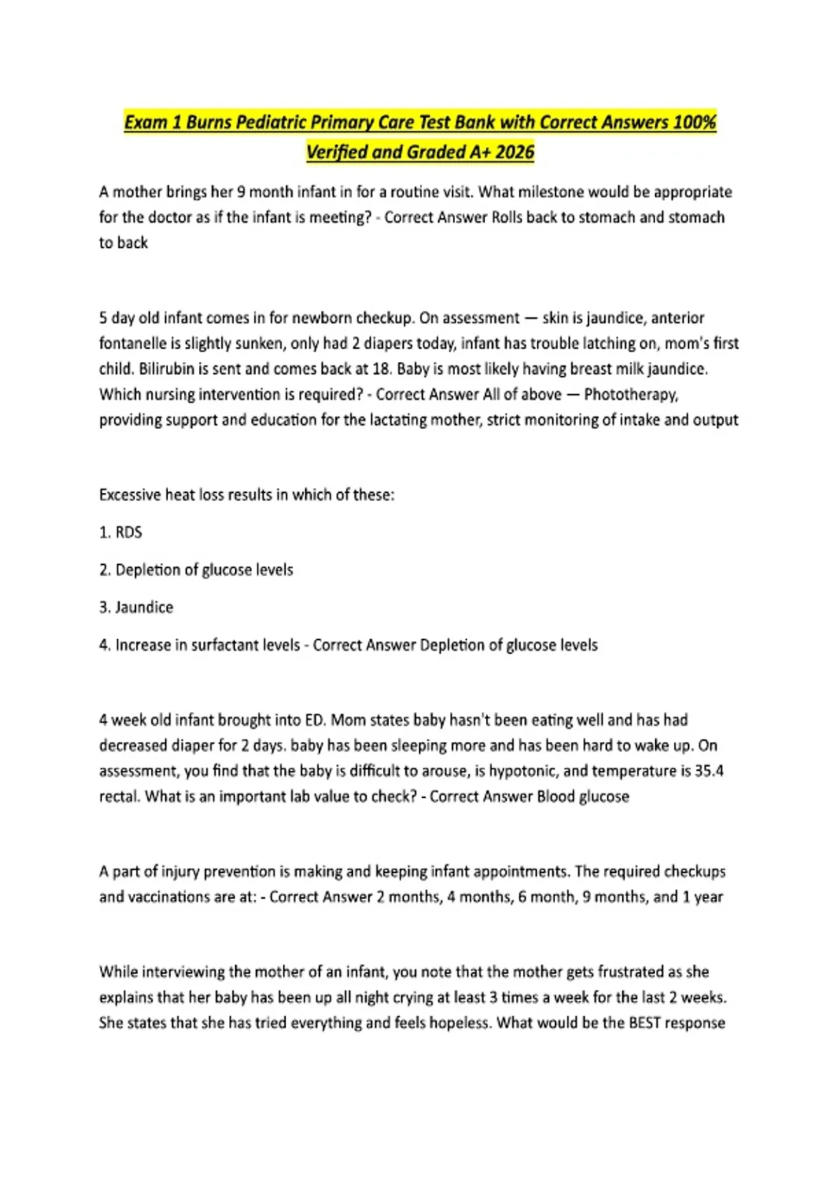 Exam 1 Burns Pediatric Primary Care Test Bank with Correct Answers 100% Verified and Graded A+ 2026 A mother brings her 9 month infant in for a routine visit. What milestone would be appropriate for the doctor as if the infant is meeting? - Correct Answer Rolls back to stomach and stomach to back 5 day old infant comes in for newborn checkup. On assessment — skin is jaundice, anterior fontanelle is slightly sunken, only had 2 diapers today, infant has trouble latching on, mom's first child. Bilirubin is sent and comes back at 18. Baby is most likely having breast milk jaundice. Which nursing intervention is required? - Correct Answer All of above — Phototherapy, providing support and education for the lactating mother, strict monitoring of intake and output Excessive heat loss results in which of these: 1. RDS 2. Depletion of glucose levels 3. Jaundice 4. Increase in surfactant levels - Correct Answer Depletion of glucose levels 4 week old infant brought into ED. Mom states baby hasn't been eating well and has had decreased diaper for 2 days. baby has been sleeping more and has been hard to wake up. On assessment, you find that the baby is difficult to arouse, is hypotonic, and temperature is 35.4 rectal. What is an important lab value to check? - Correct Answer Blood glucose A part of injury prevention is making and keeping infant appointments. The required checkups and vaccinations are at: - Correct Answer 2 months, 4 months, 6 month, 9 months, and 1 year While interviewing the mother of an infant, you note that the mother gets frustrated as she explains that her baby has been up all night crying at least 3 times a week for the last 2 weeks. She states that she has tried everything and feels hopeless. What would be the BEST response