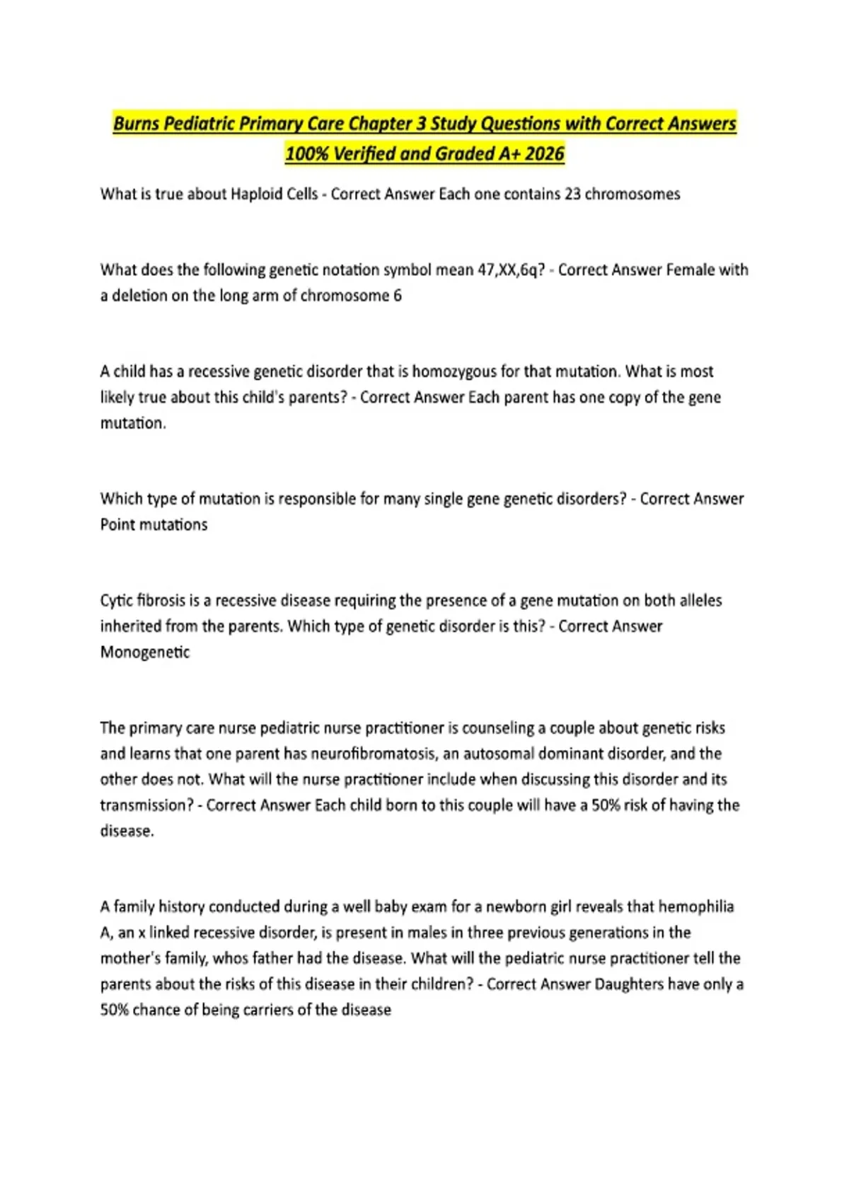 Burns Pediatric Primary Care Chapter 3 Study Questions with Correct Answers 100% Verified and Graded A+ 2026 What is true about Haploid Cells - Correct Answer Each one contains 23 chromosomes What does the following genetic notation symbol mean 47,XX,6q? - Correct Answer Female with a deletion on the long arm of chromosome 6 A child has a recessive genetic disorder that is homozygous for that mutation. What is most likely true about this child's parents? - Correct Answer Each parent has one copy of the gene mutation. Which type of mutation is responsible for many single gene genetic disorders? - Correct Answer Point mutations Cytic fibrosis is a recessive disease requiring the presence of a gene mutation on both alleles inherited from the parents. Which type of genetic disorder is this? - Correct Answer Monogenetic The primary care nurse pediatric nurse practitioner is counseling a couple about genetic risks and learns that one parent has neurofibromatosis, an autosomal dominant disorder, and the other does not. What will the nurse practitioner include when discussing this disorder and its transmission? - Correct Answer Each child born to this couple will have a 50% risk of having the disease. A family history conducted during a well baby exam for a newborn girl reveals that hemophilia A, an x linked recessive disorder, is present in males in three previous generations in the mother's family, whos father had the disease. What will the pediatric nurse practitioner tell the parents about the risks of this disease in their children? - Correct Answer Daughters have only a 50% chance of being carriers of the disease