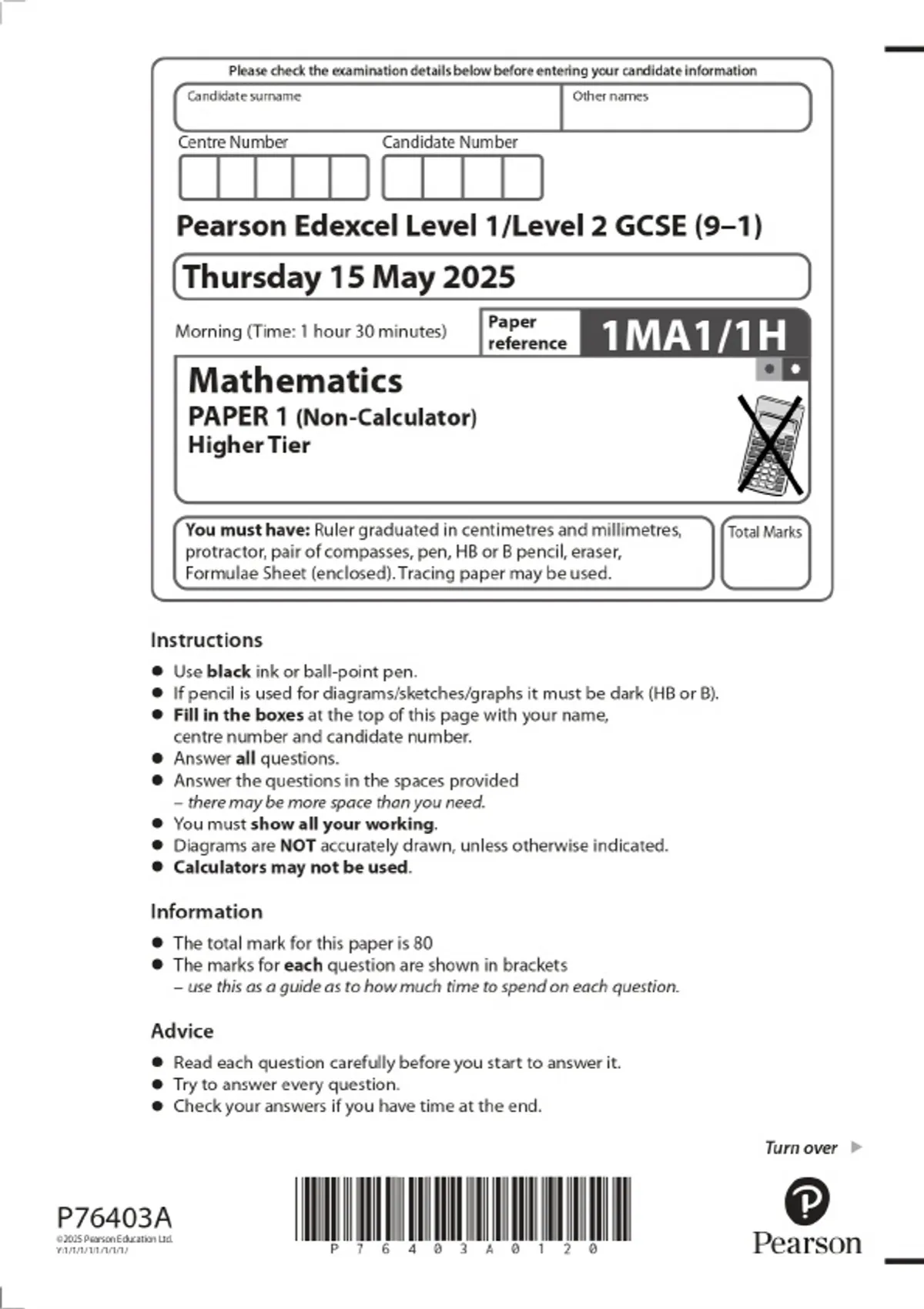 2025 Pearson Edexcel Level 1/Level 2 GCSE (9–1) Mathematics PAPER 1 (Non-Calculator) Higher Tier Combined Question Paper & Marking Scheme