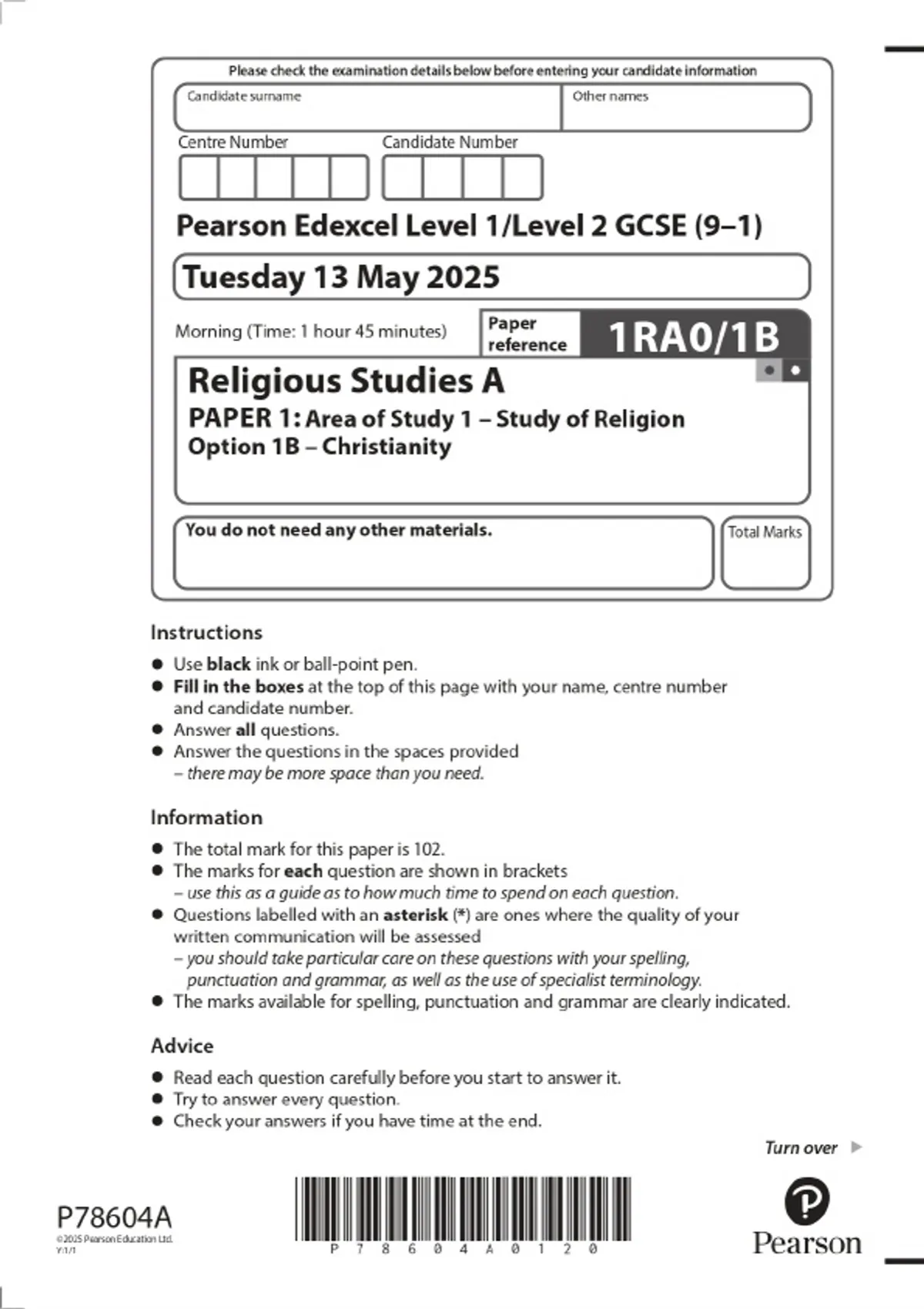 2025 Pearson Edexcel Level 1/Level 2 GCSE (9–1) Religious Studies A PAPER 1: Area of Study 1 – Study of Religion Option 1B – Christianity Combined Question Paper & Marking Scheme