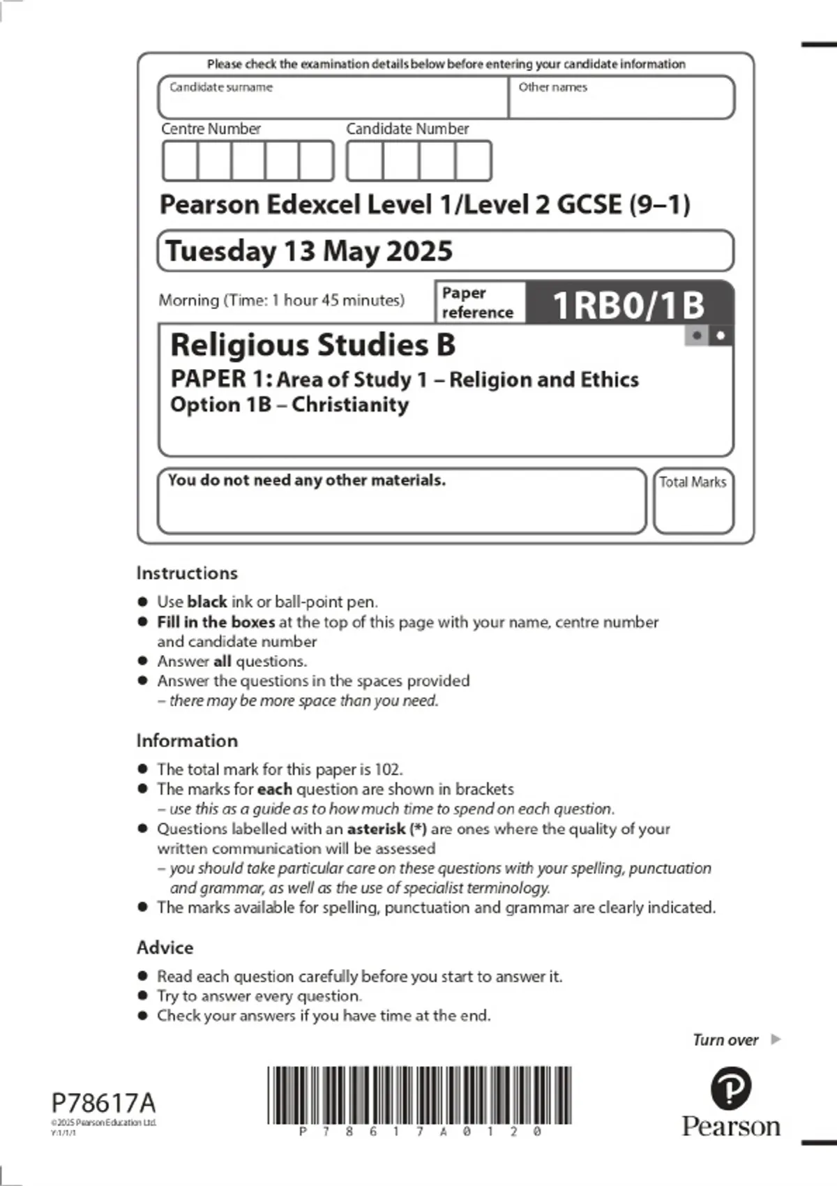 2025 Pearson Edexcel Level 1/Level 2 GCSE (9–1) Religious Studies B PAPER 1: Area of Study 1 – Religion and Ethics Option 1B – Christianity Combined Question Paper &Final Marking Scheme