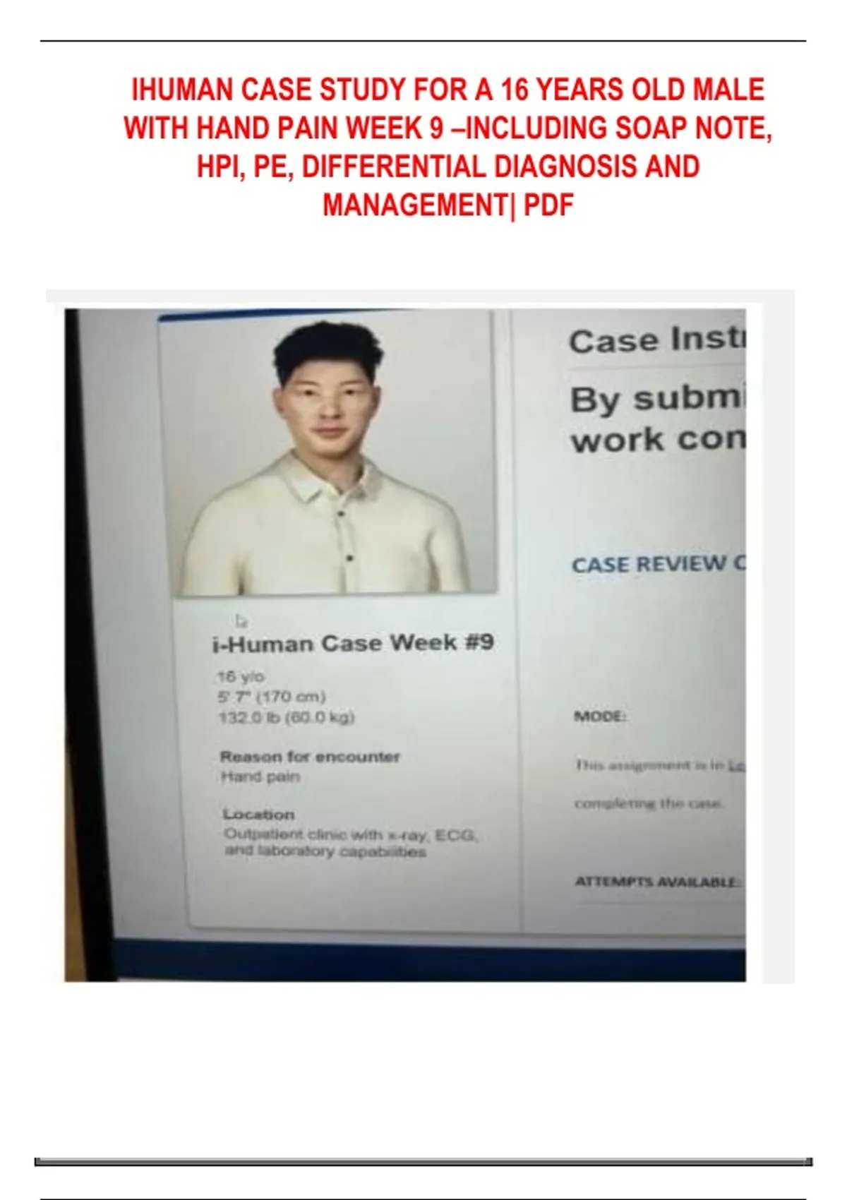IHUMAN CASE STUDY FOR A 16 YEARS OLD MALE WITH HAND PAIN WEEK 9 –INCLUDING SOAP NOTE, HPI, PE, DIFFERENTIAL DIAGNOSIS AND MANAGEMENT| PDF