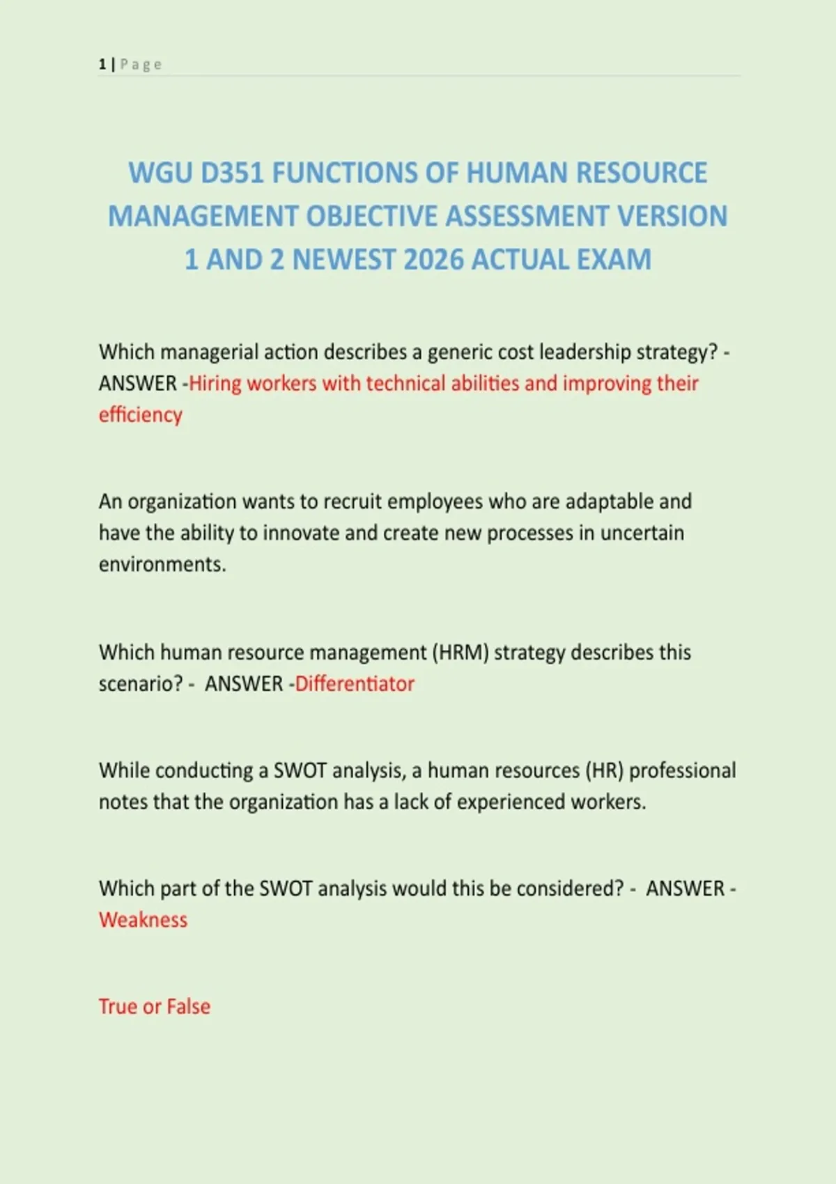 WGU D351 FUNCTIONS OF HUMAN RESOURCE