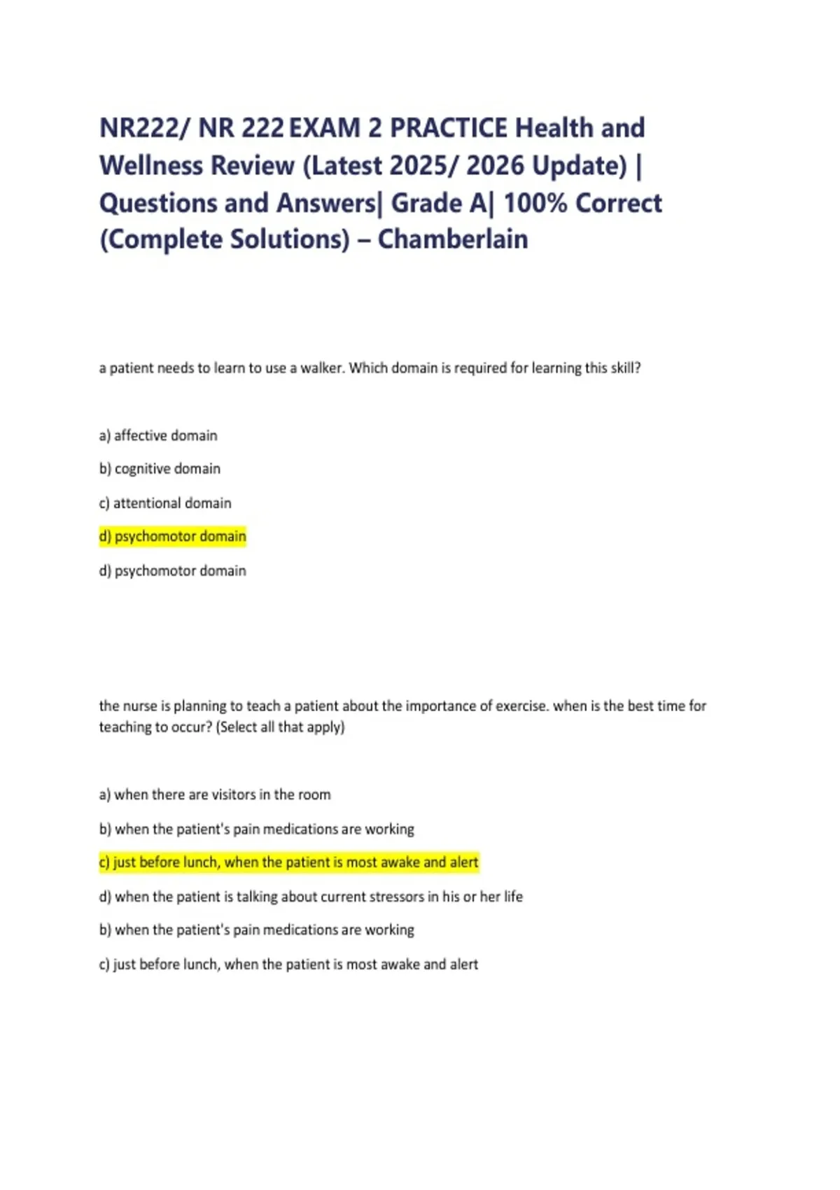 Prepare effectively for NR222 Exam 2: Health and Wellness with this Practice Questions and Answers Package with Solution updated , a comprehensive study resource for nursing students. This package includes exam-style questions with detailed, step-by-step solutions, covering essential topics such as health promotion, disease prevention, wellness assessment, patient education, lifestyle modification, nutrition, mental health, and holistic nursing interventions.