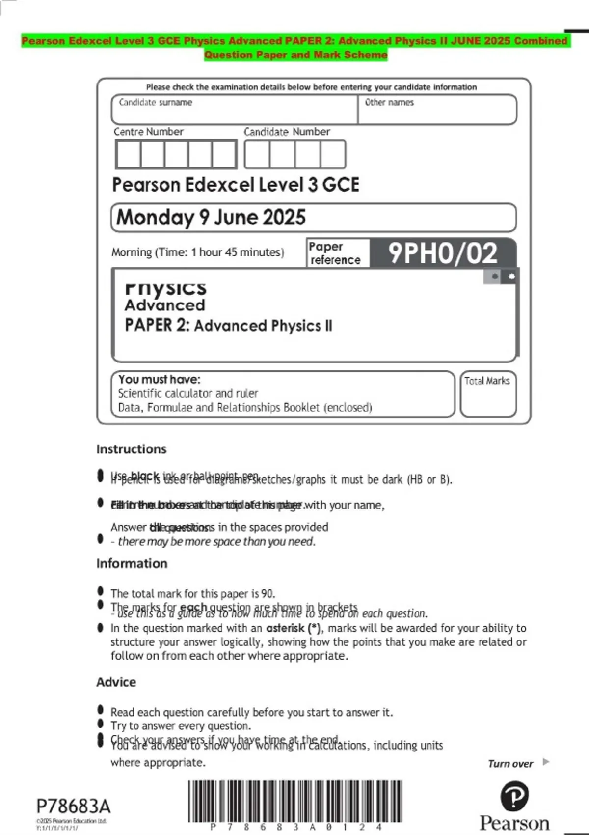 Pearson Edexcel Level 3 GCE Physics Advanced PAPER 2: Advanced Physics II JUNE 2025 Combined Question Paper and Mark Scheme