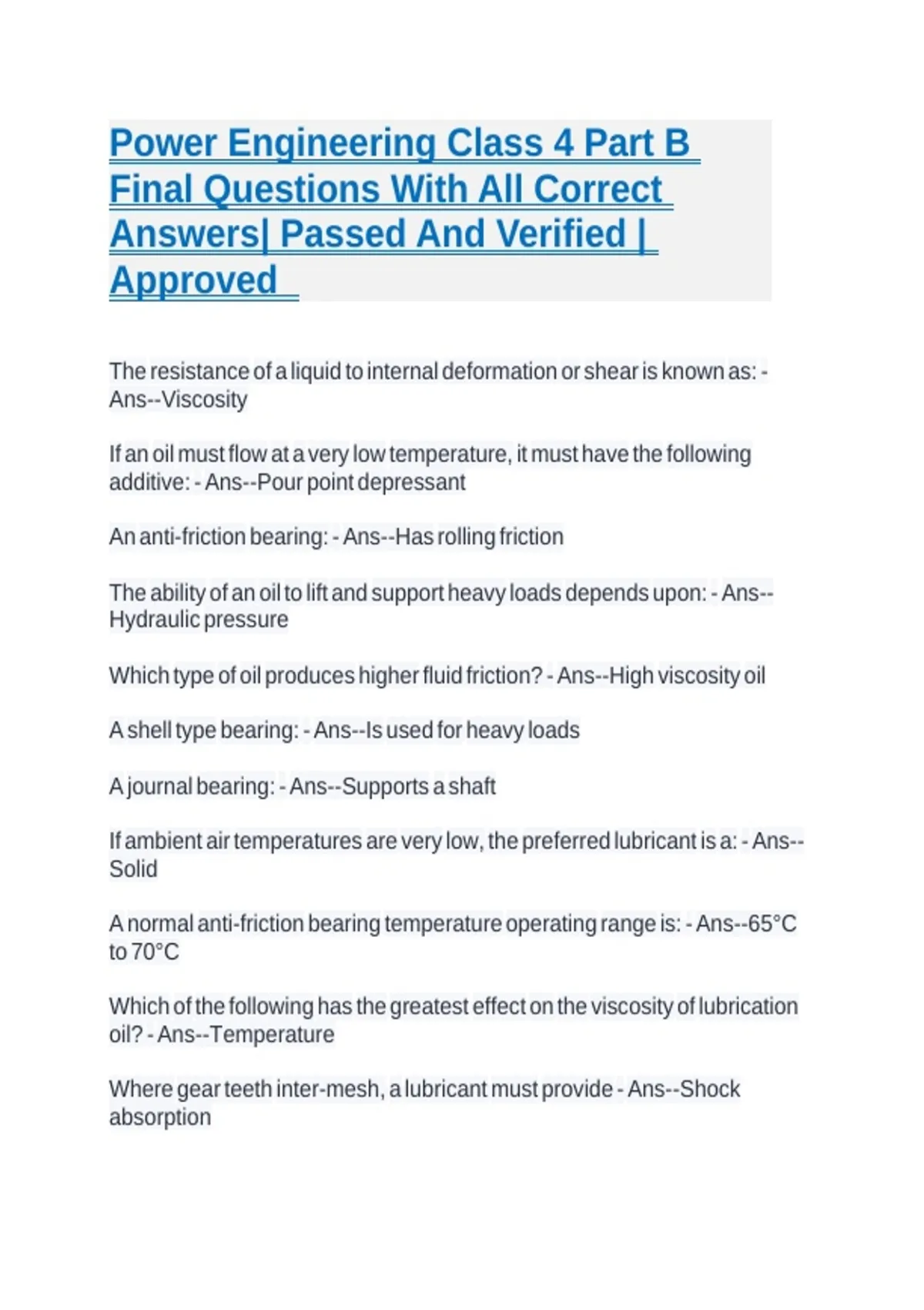 Power Engineering Class 4 Part B Final Questions With All Correct Answers| Passed And Verified | Approved