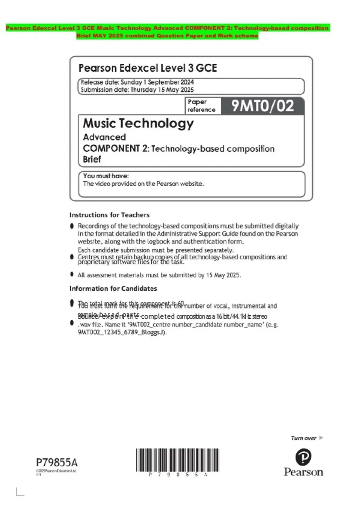 Pearson Edexcel Level 3 GCE Music Technology Advanced COMPONENT 2: Technology-based composition Brief MAY 2025 combined Question Paper and Mark scheme